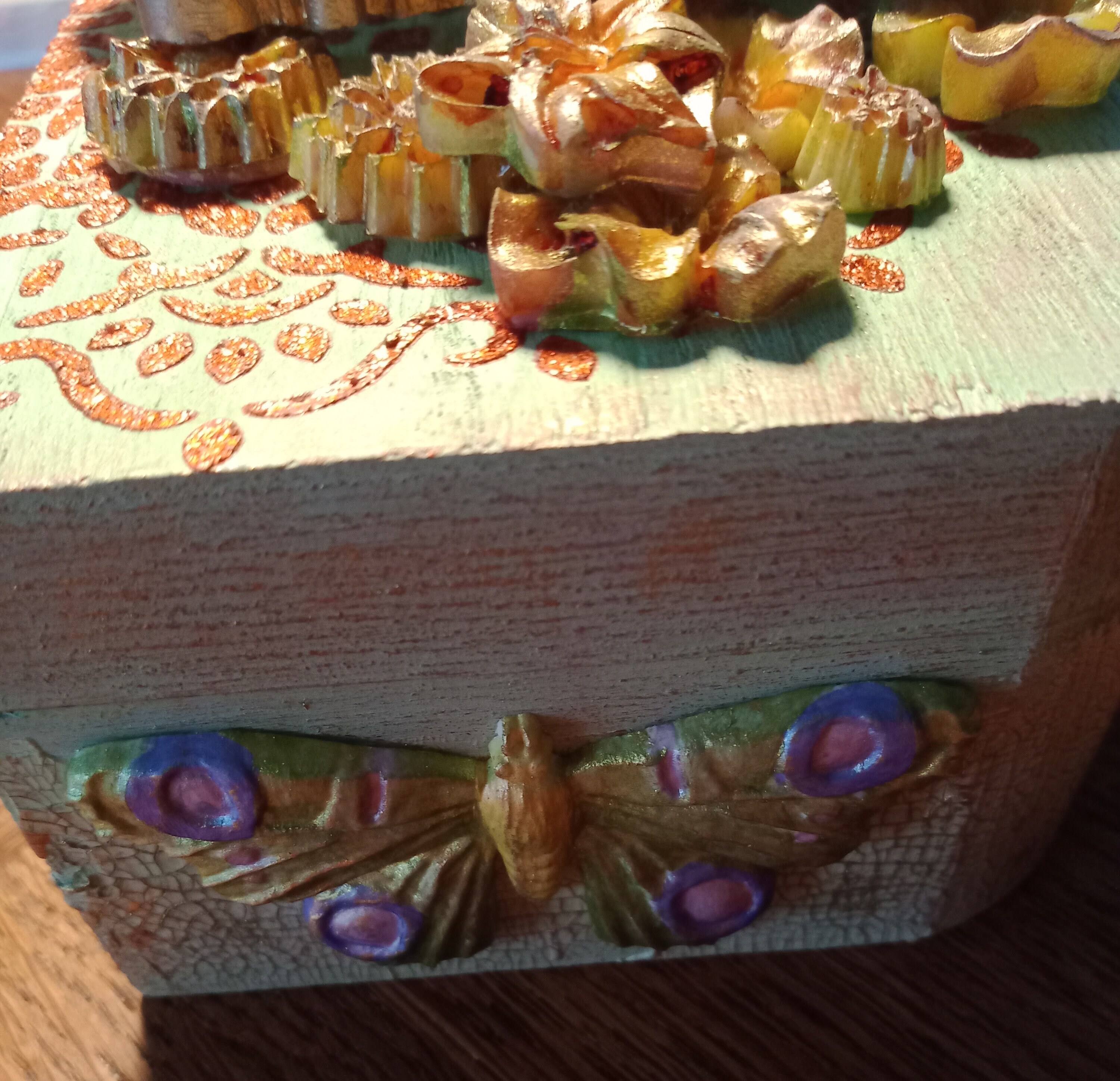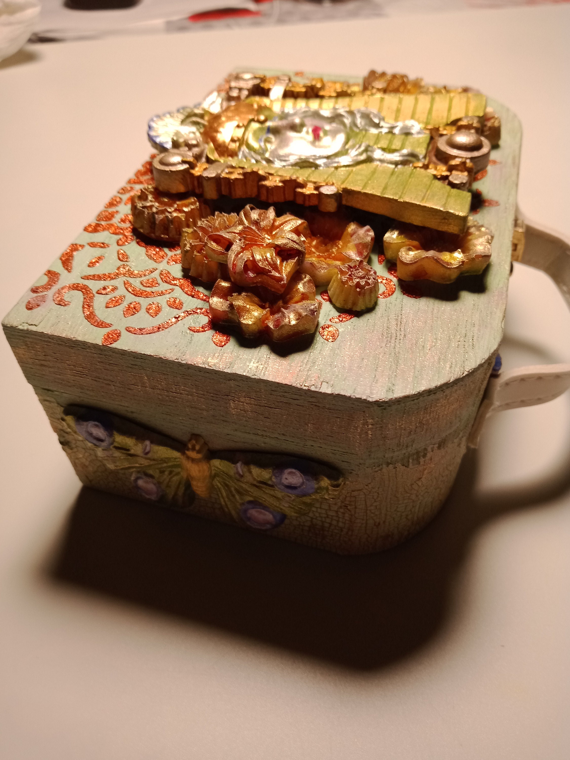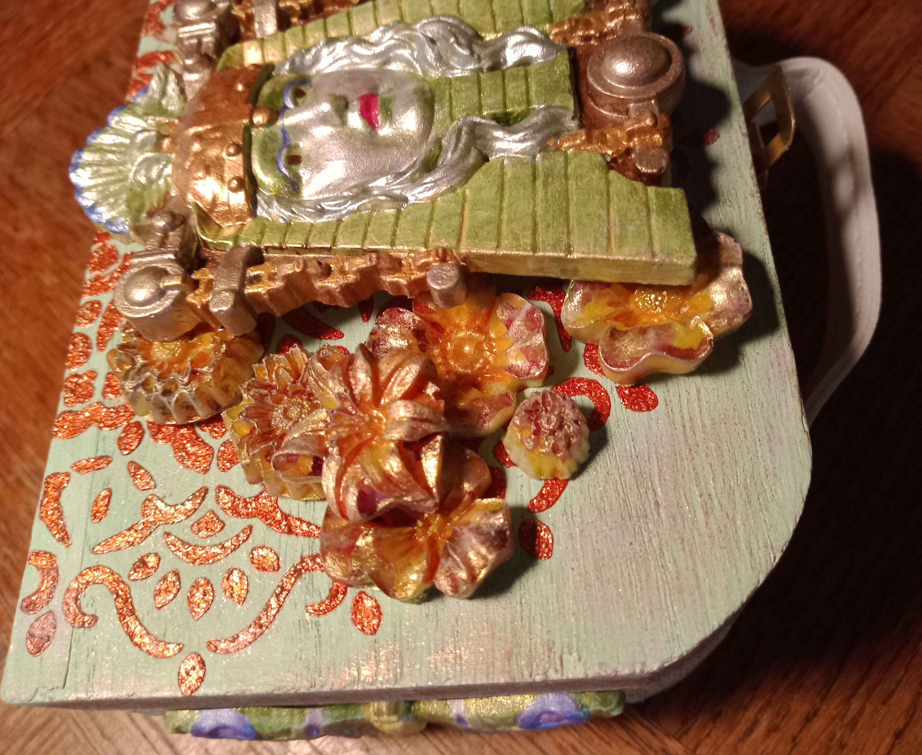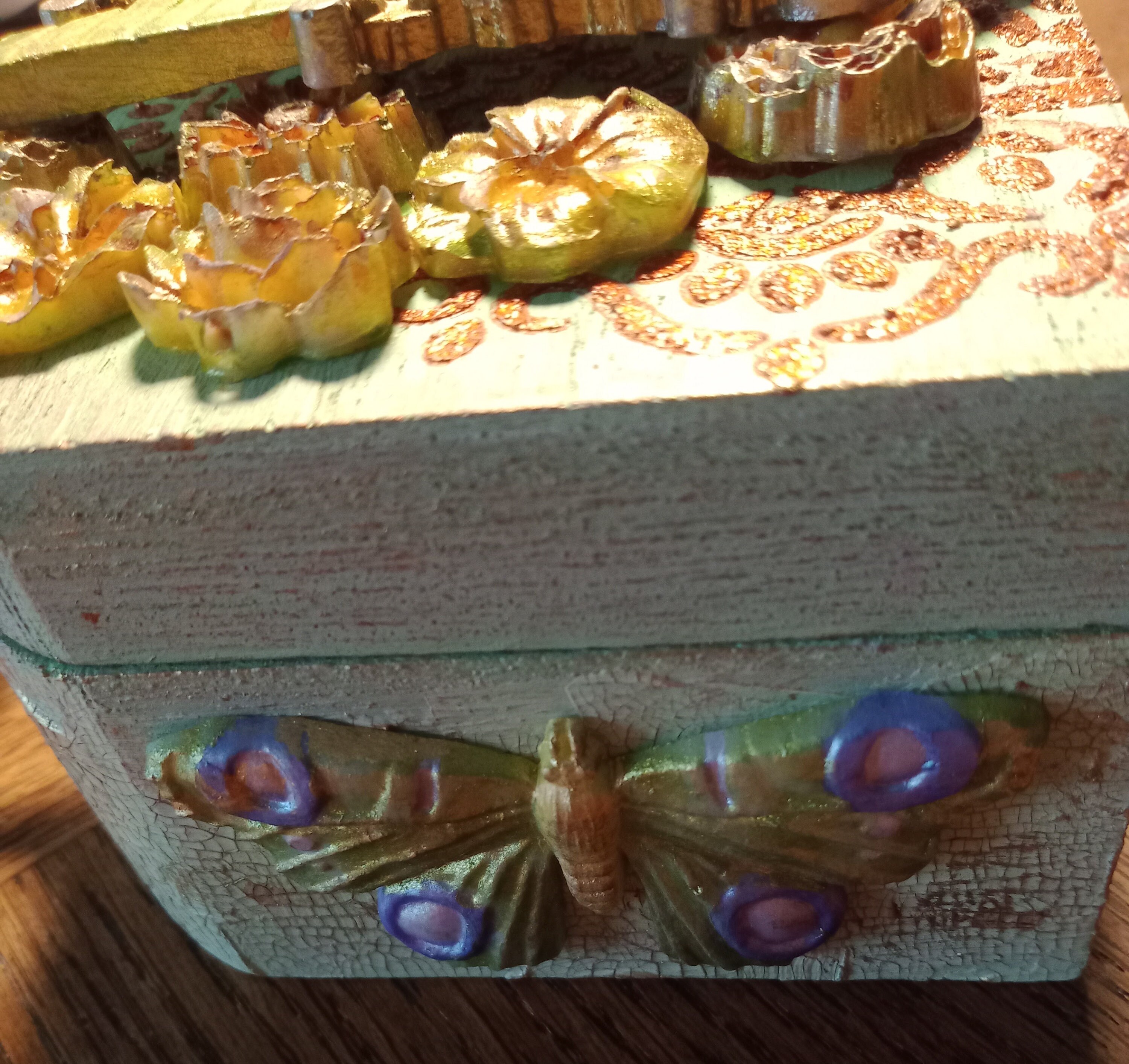 Small green box for storing small items, business cards, keys... Catch-all tray It is decorated with moldings and colored with acrylics and a touch of wax. It's small in size, with dimensions of 13.5*9.5*6cm It has a small handle for carrying.