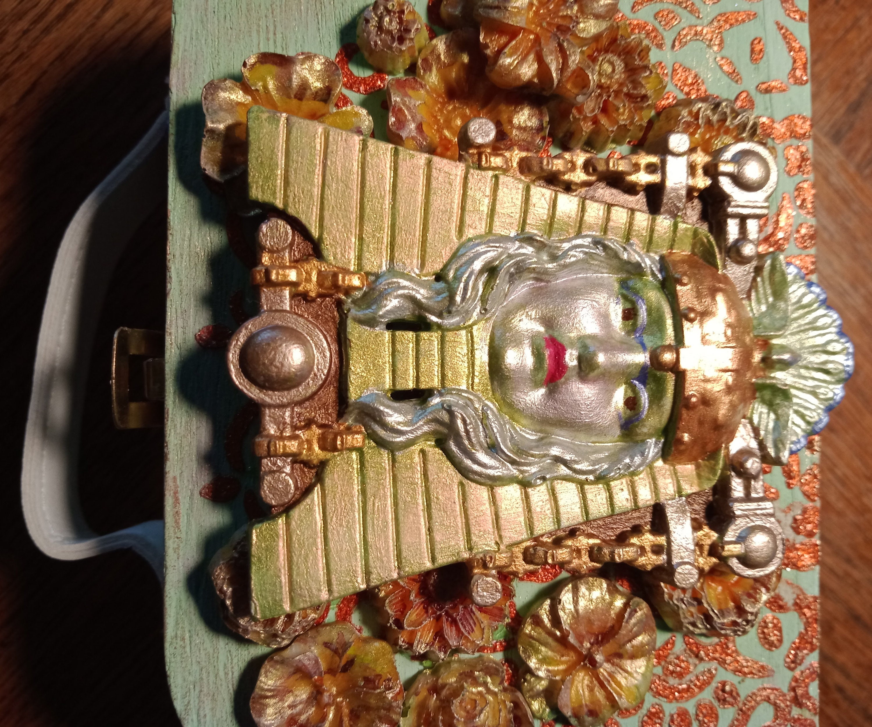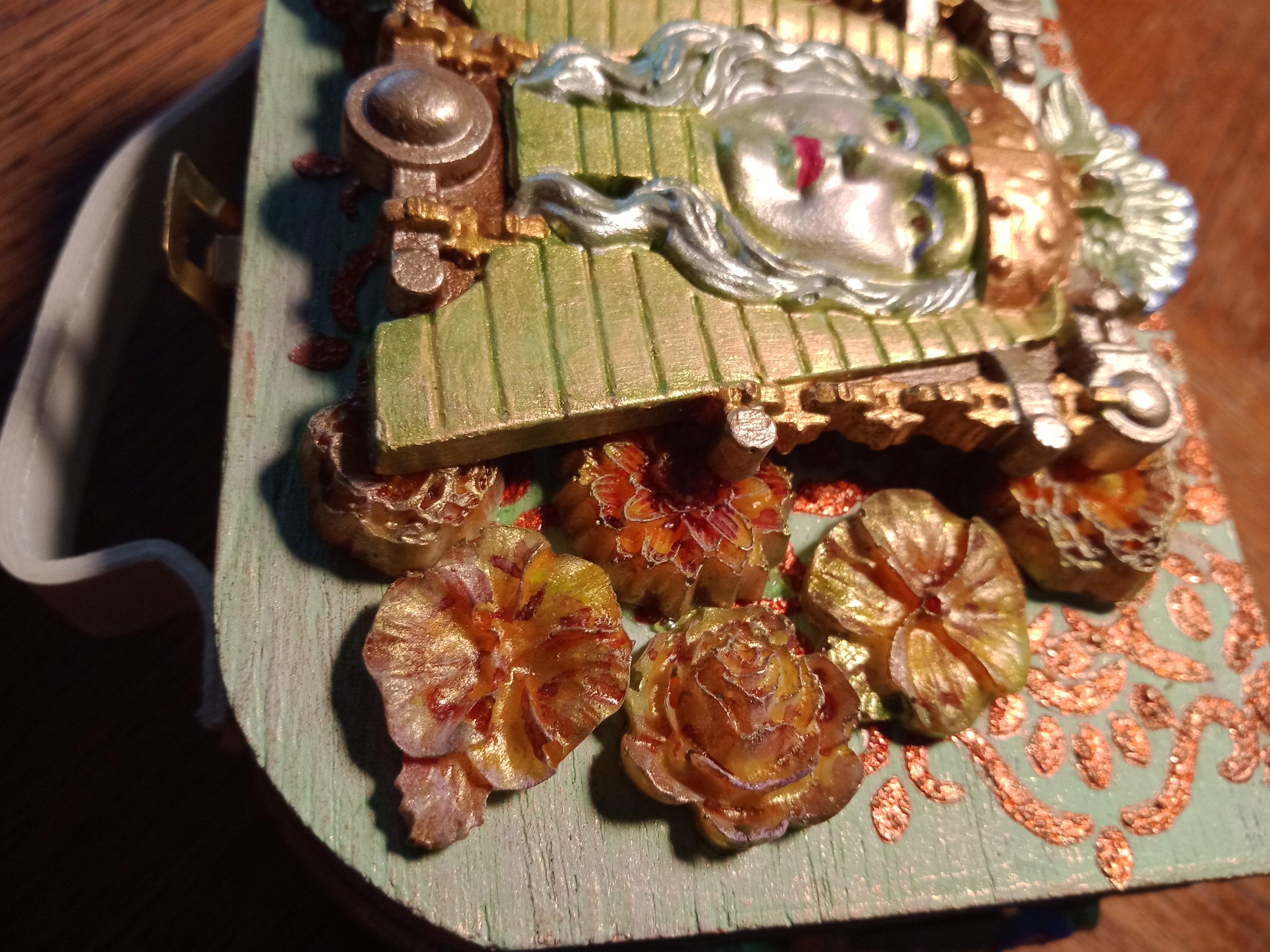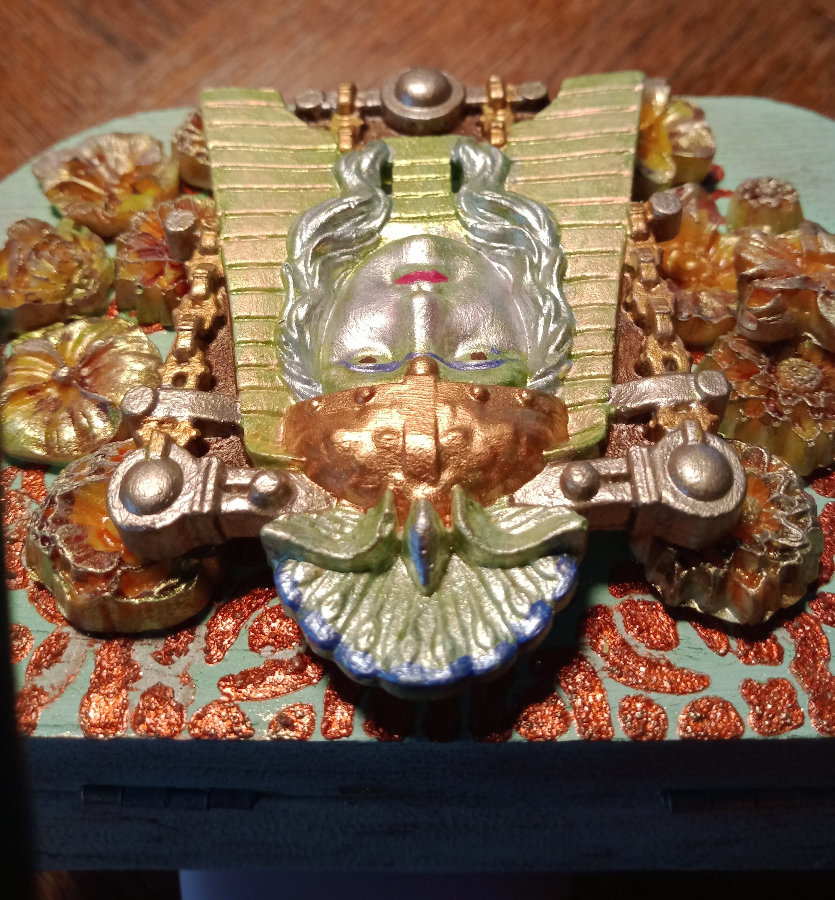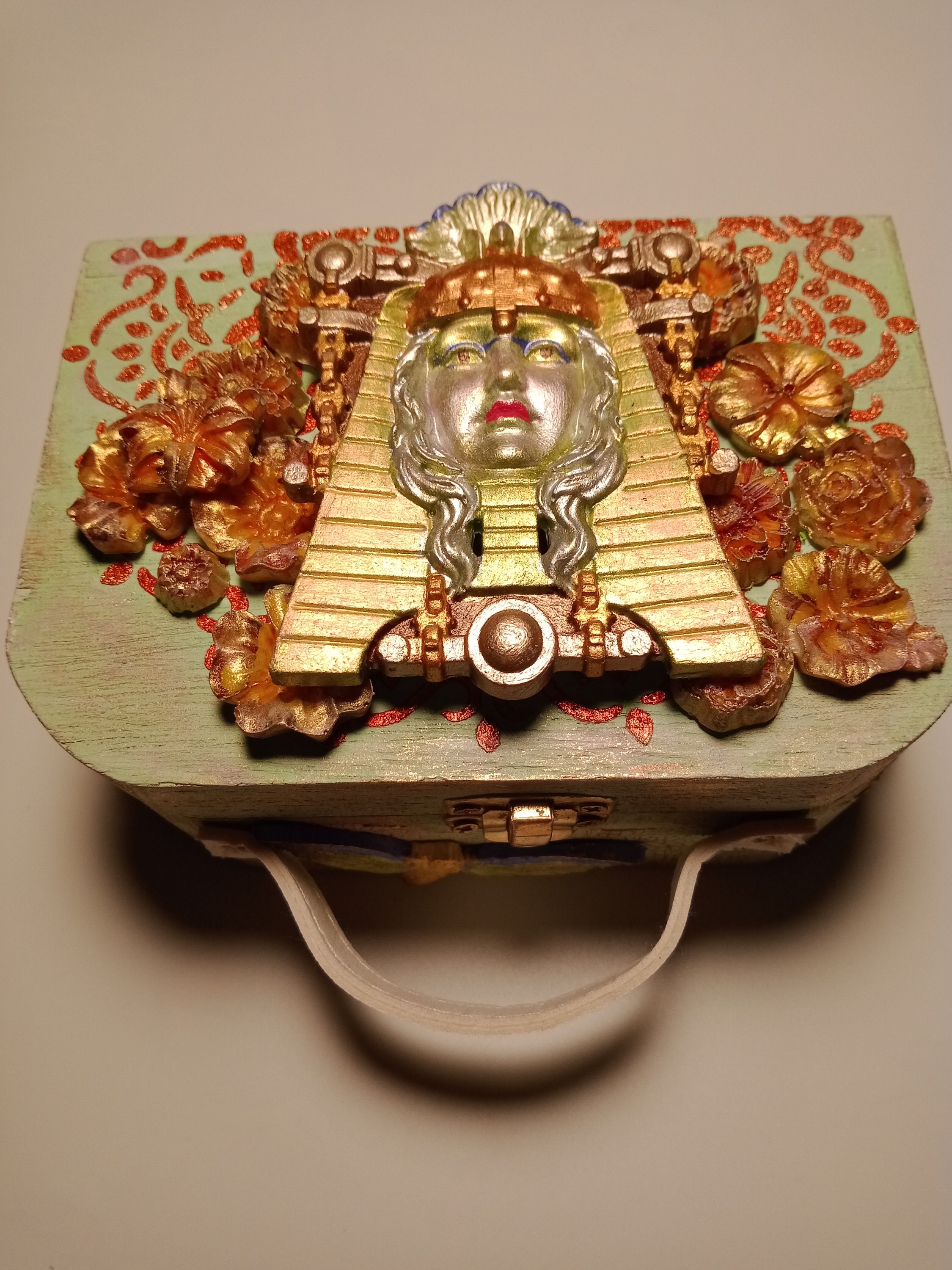 Small green box for storing small items, business cards, keys... Catch-all tray It is decorated with moldings and colored with acrylics and a touch of wax. It's small in size, with dimensions of 13.5*9.5*6cm It has a small handle for carrying.