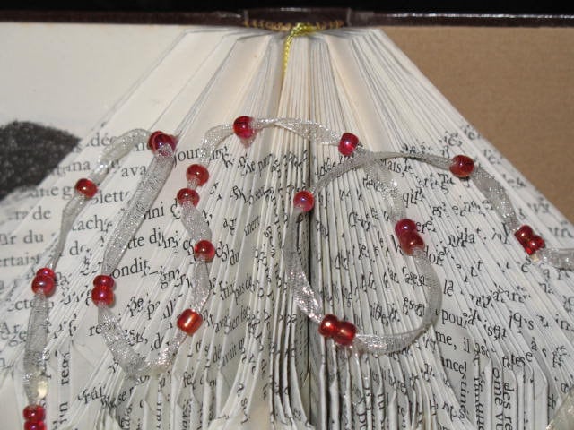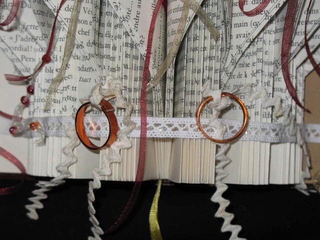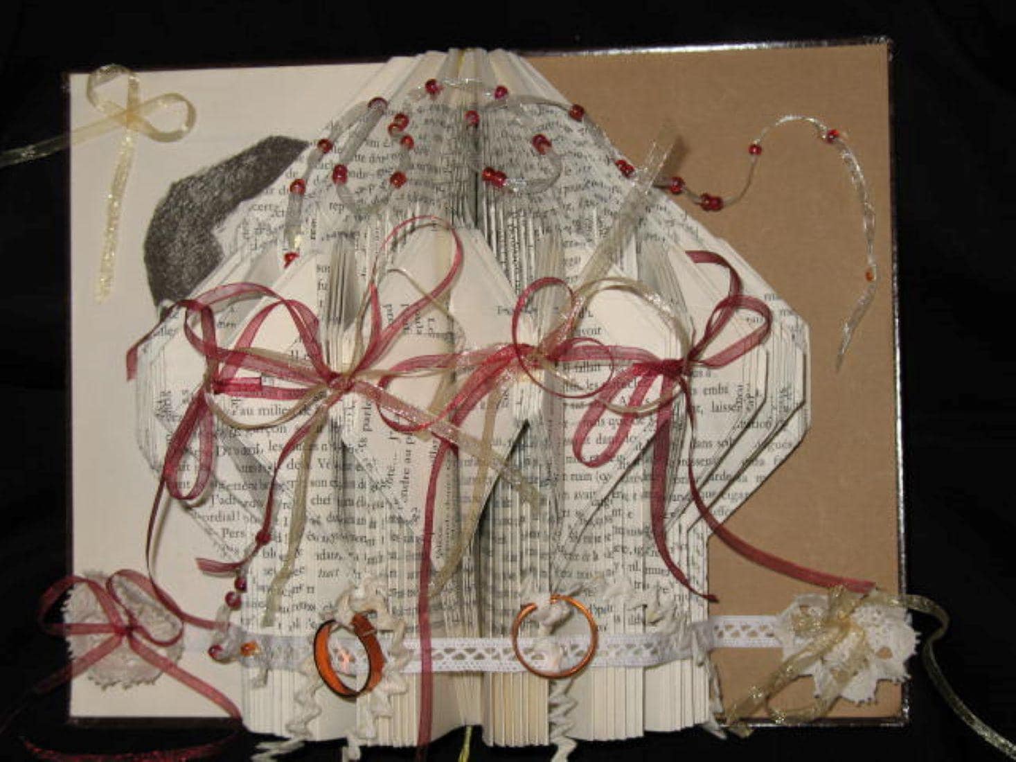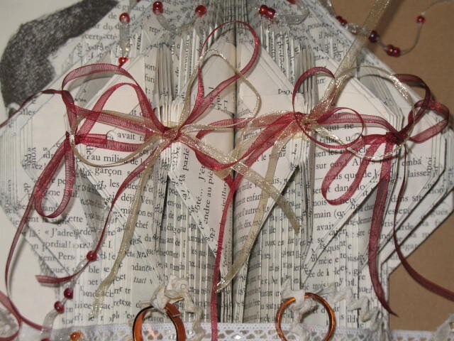 Un livre plié pour former un coussin pour les alliances des futurs mariés. Il est léger, pour un enfant qui le porterait.
