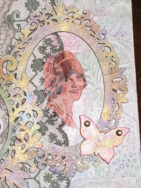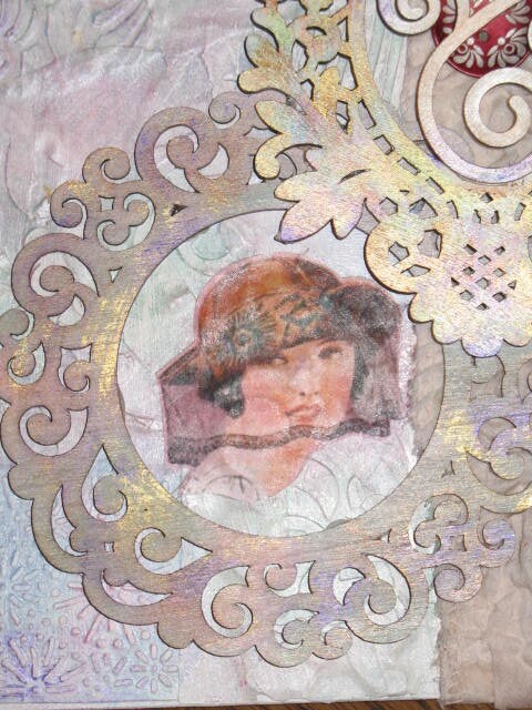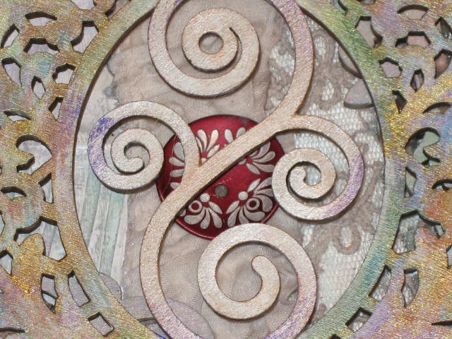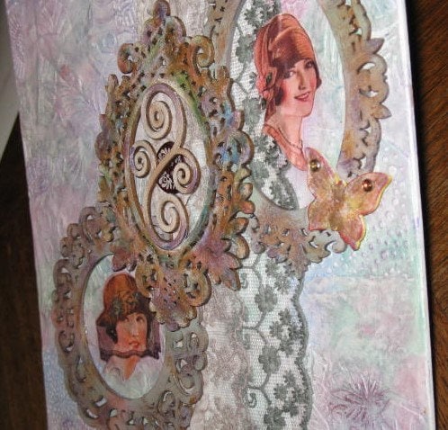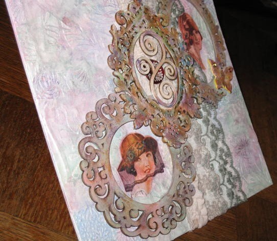 Tableau, Collage d'éléments sur toile. Embellissements bois, et dentelles.