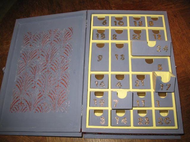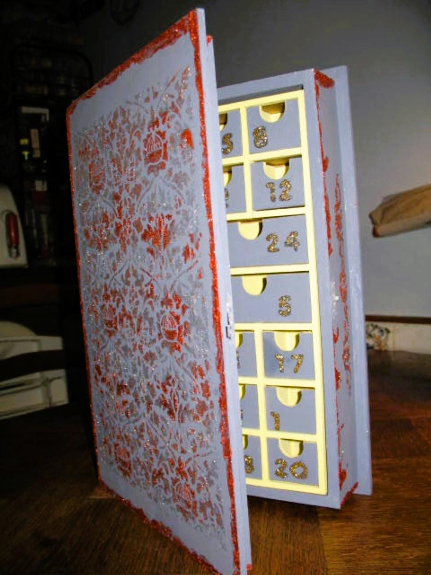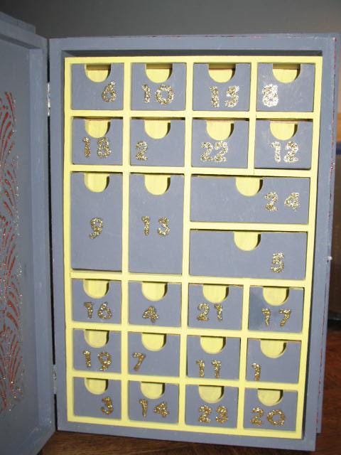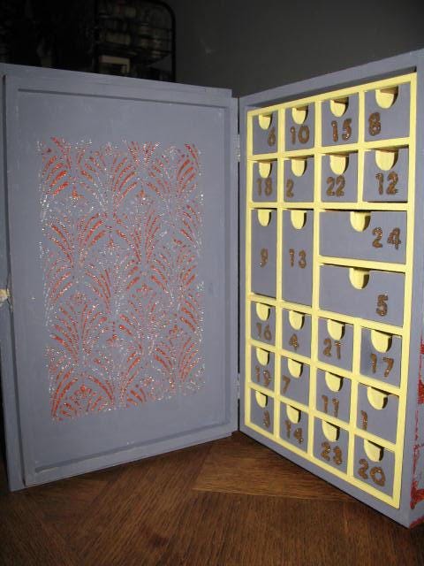 Calendrier de l'Avant original de par sa forme, une boîte, et ses couleurs, bleu, rouge et jaune. C'est une boite qui contient un bac amovible avec des tiroirs. Ce qui implique que vous pourrez vous resservir de la boite vide si vous le voulez. Les numéros sont dans le désordre. dimensions: 33cm*22cm*7cm