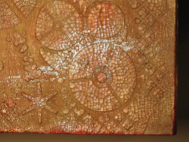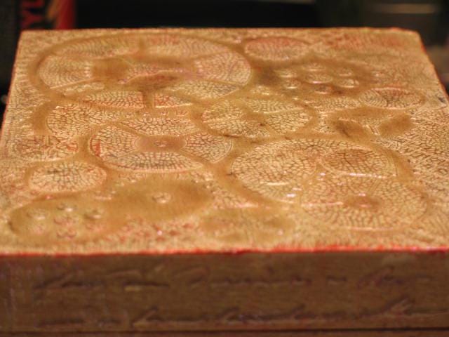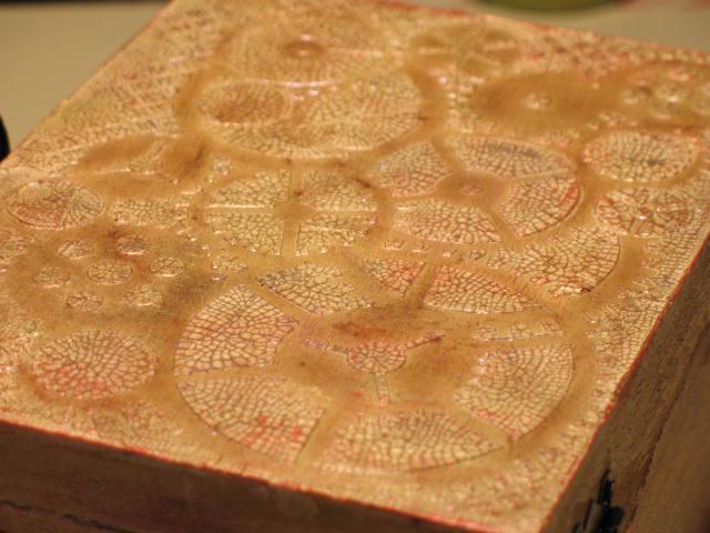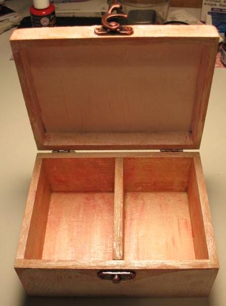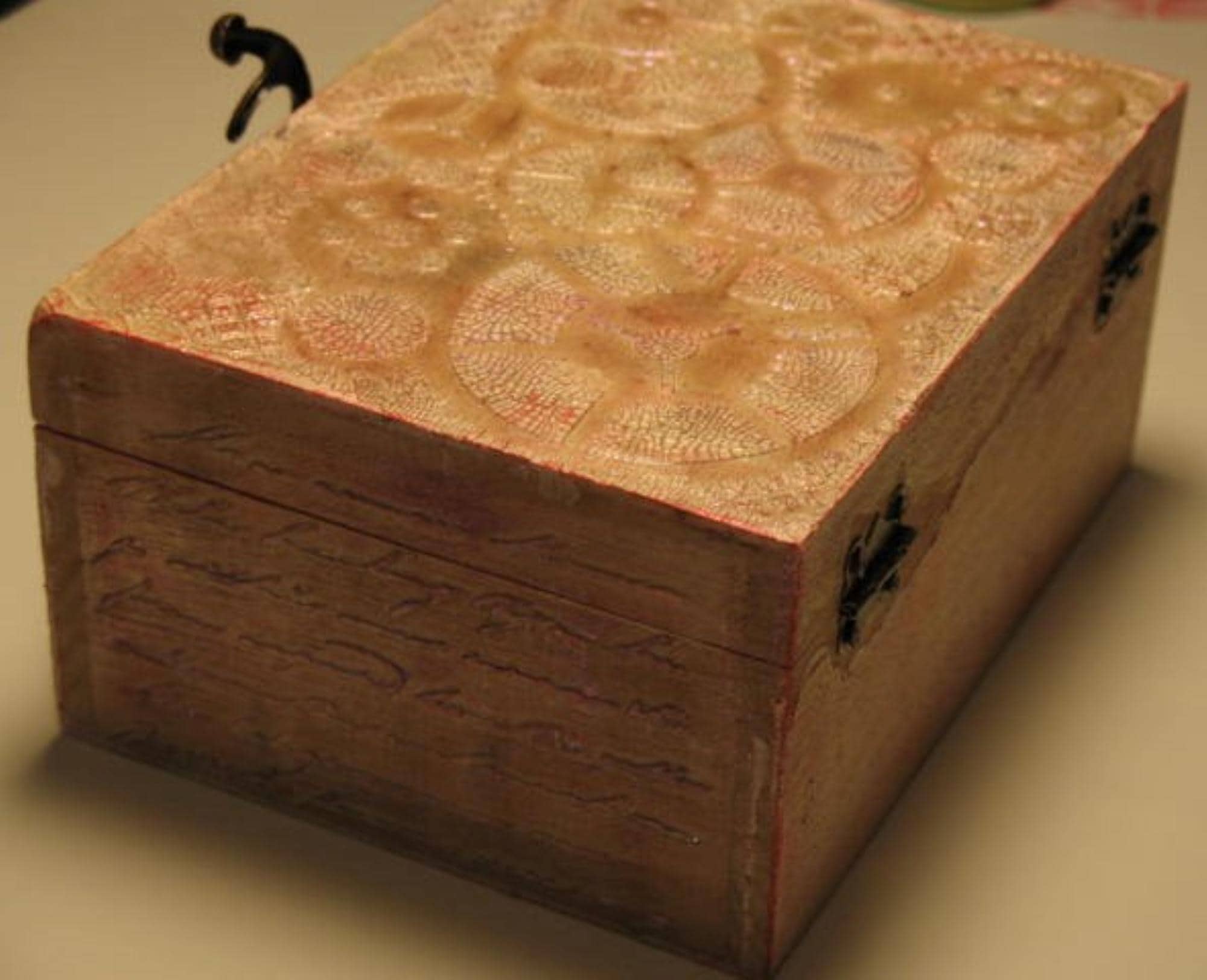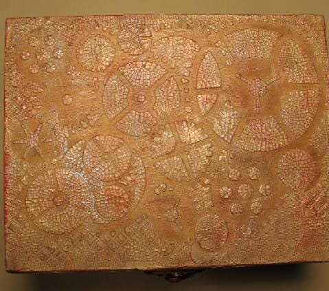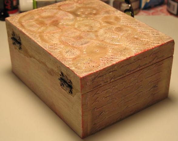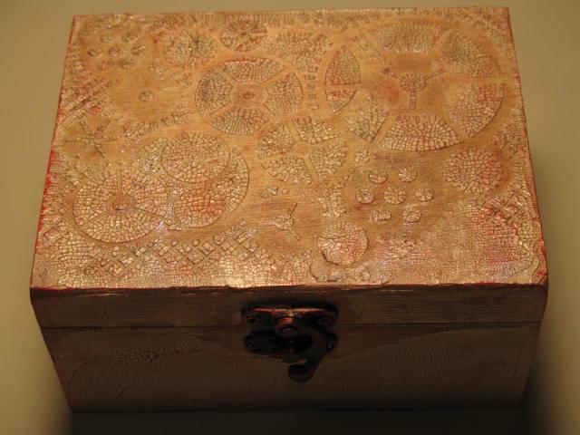 Pretty, customized tea, herbal tea, or storage box. Made of wood. Decoration depicting gears and writing made with stencils and texture paste. Coloured with acrylics and waxes. Dimensions: 14.5*11*7cm