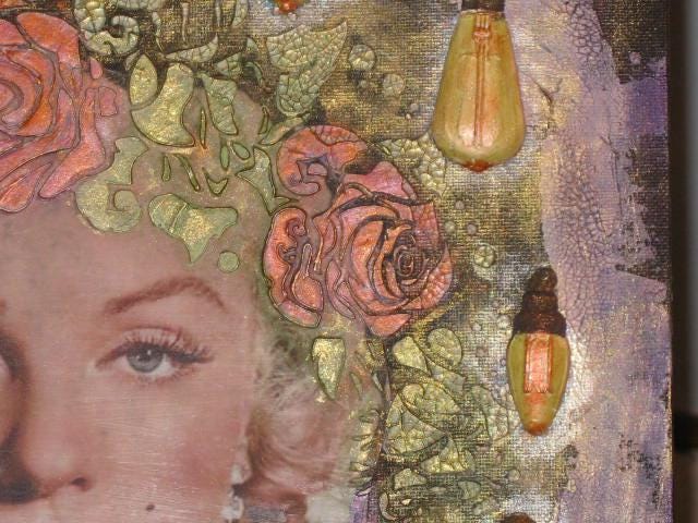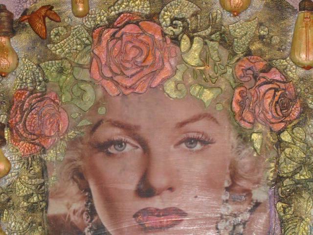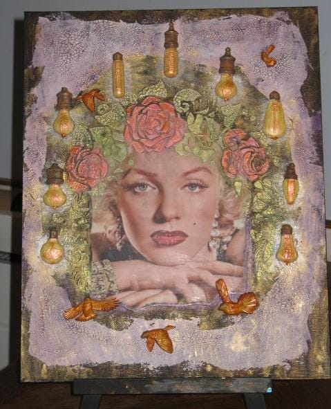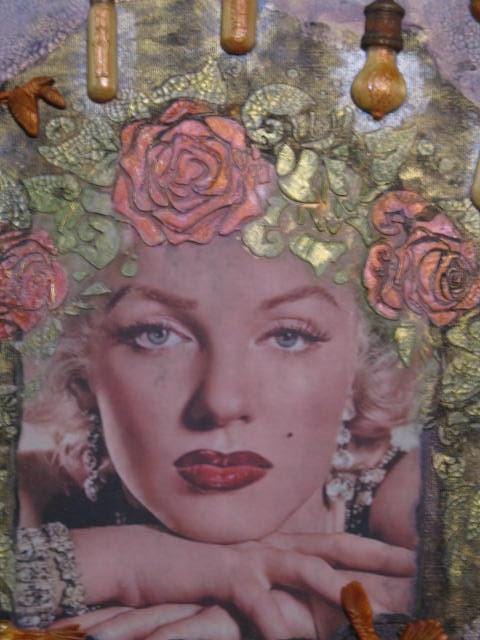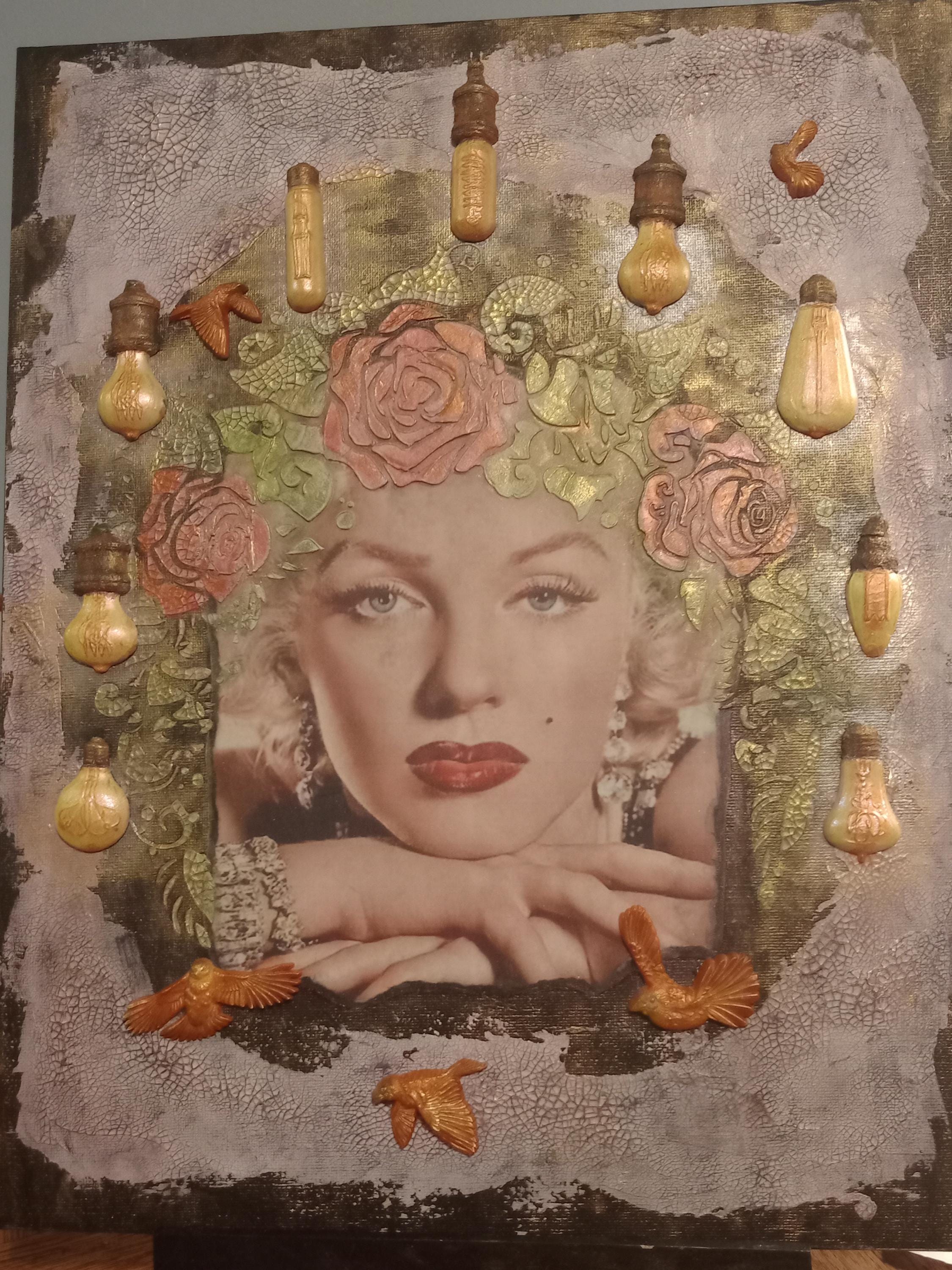 Tableau fait de collages, moulages, pate à relief colorisés. Photo internet de Marylin en accès libre. Pour les fans de cette belle actrice trop tôt disparue. Un hommage original. Dimensions: 41cm*33cm