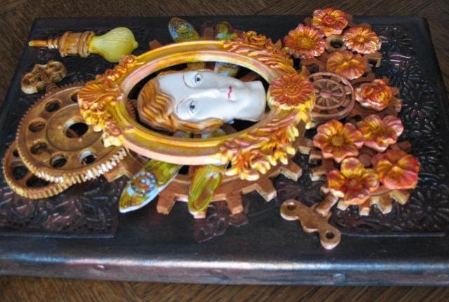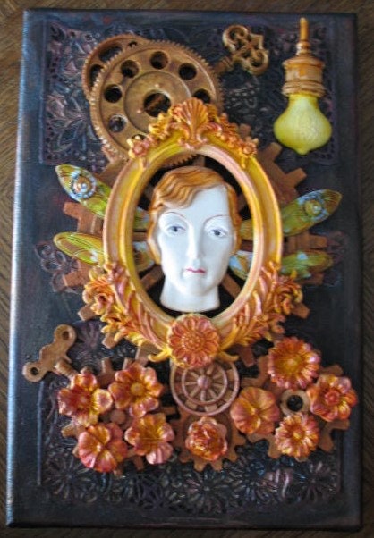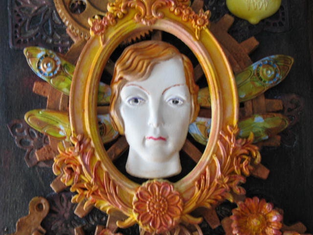 Tableau de mix media collage sur toile en châssis. Visage vintage Décoration murale faite de moulages et colorisation acrylique et cires Idéal cadeau pour ceux qui aiment le style Steam Punk. Ou on se l'offre c'est aussi bien. Dimensions: 23,5cm*15,5