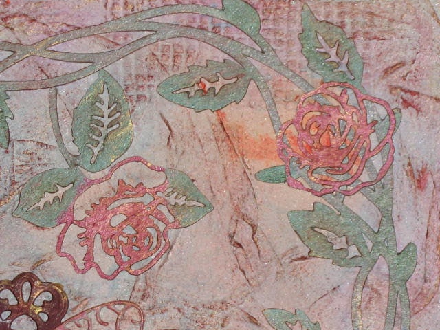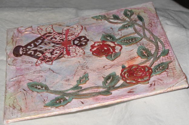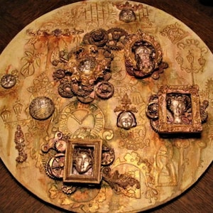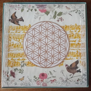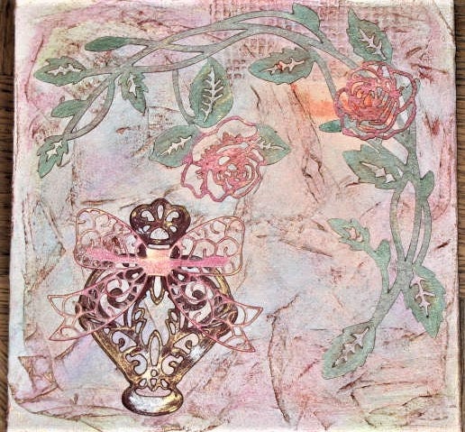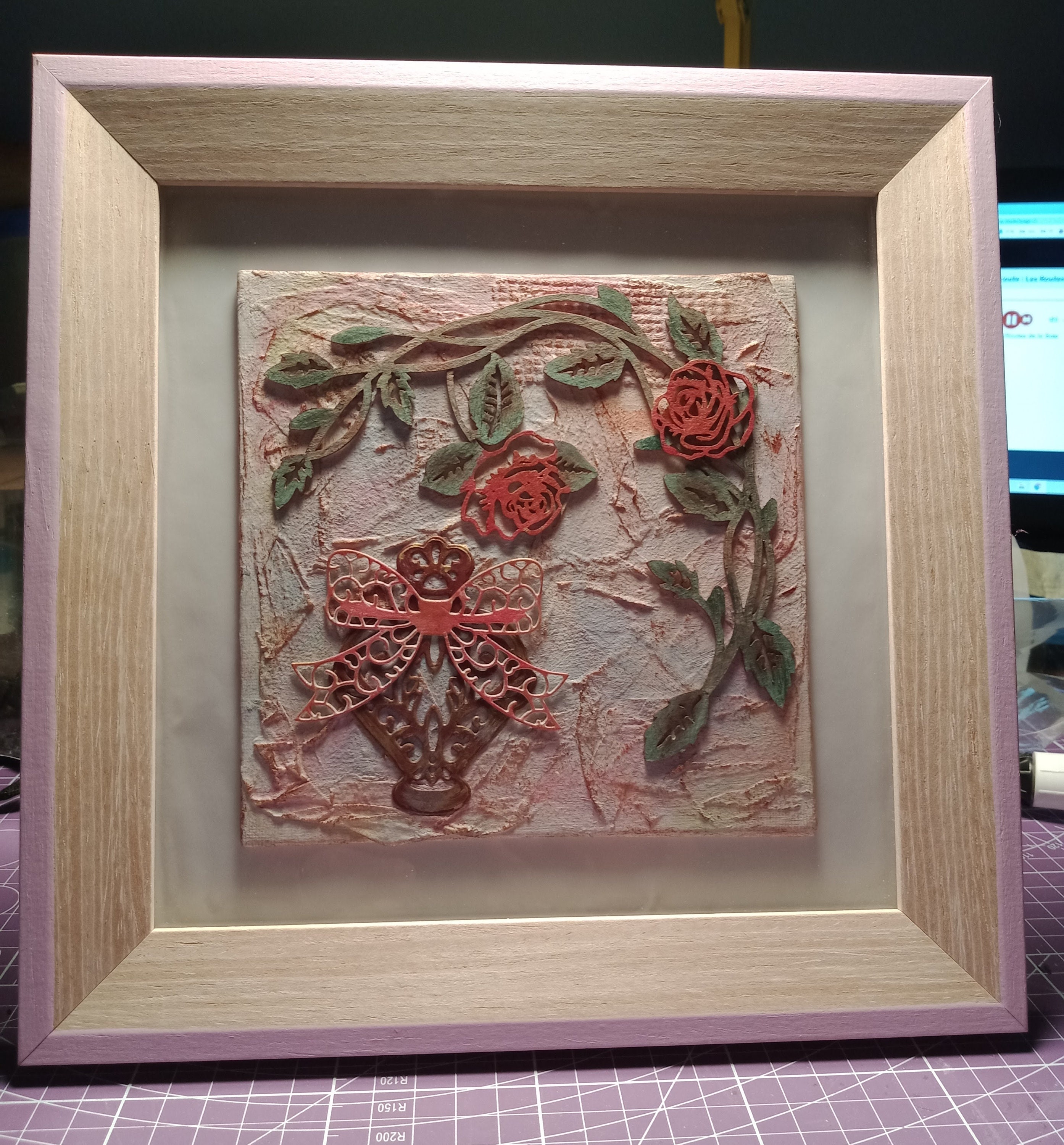 Collage on canvas against a fabric background, embellished with colored wood and cardboard A simple, inexpensive, and original little gift for any occasion. A lovely gesture. Square natural wood frame with a pastel pink border Dimensions 15cm x 15cm excluding frame To hang