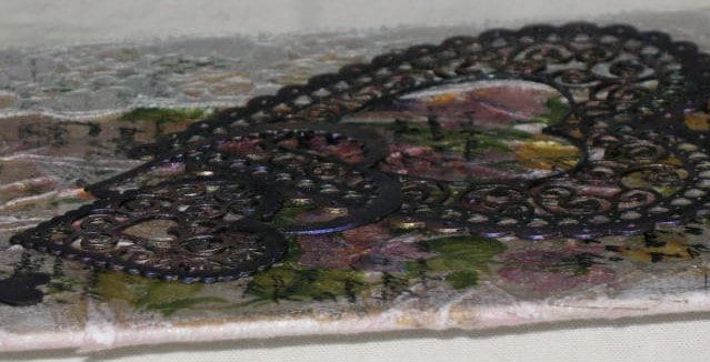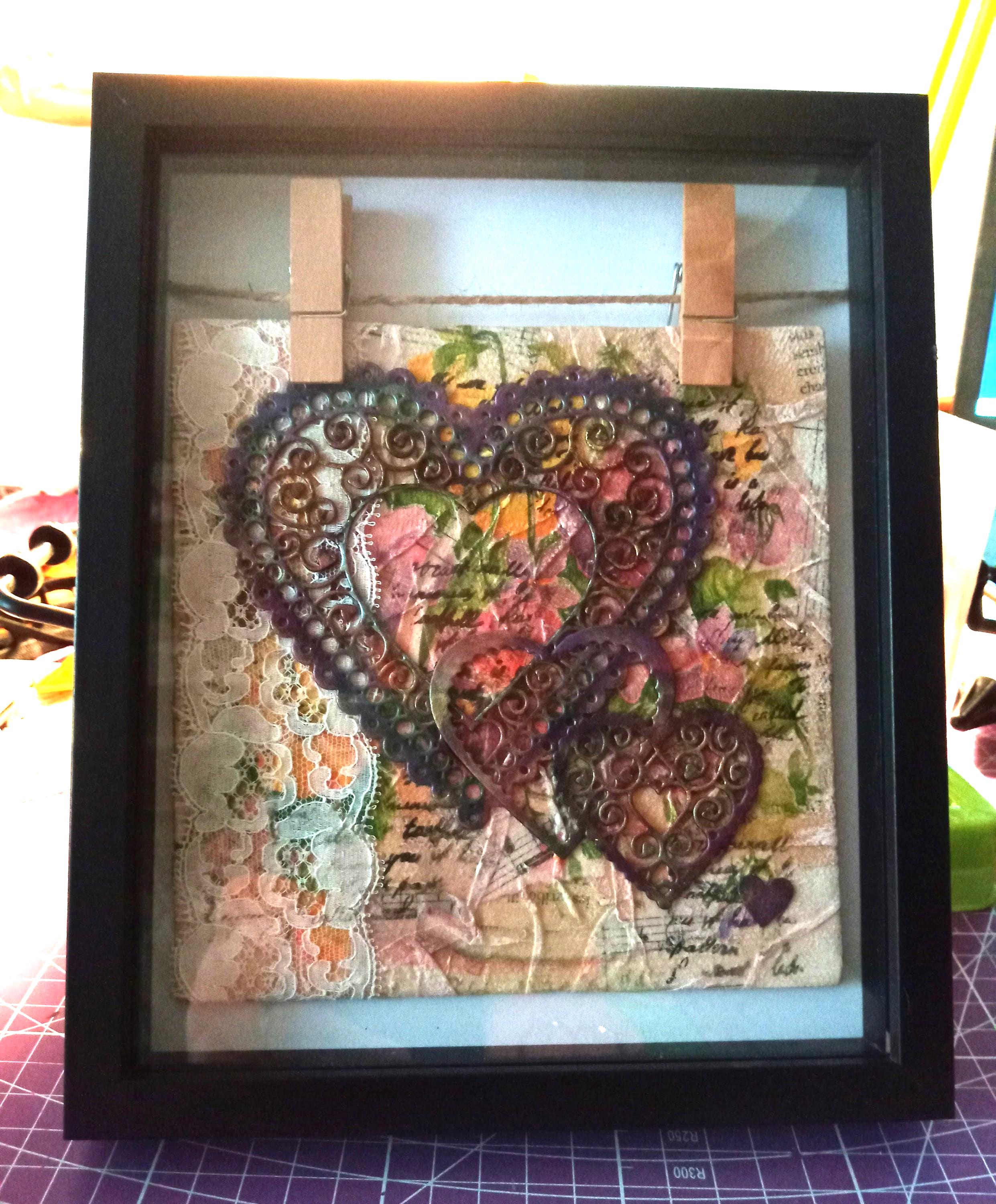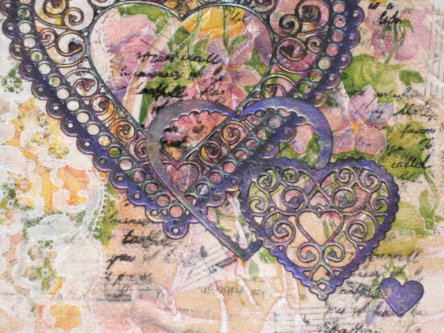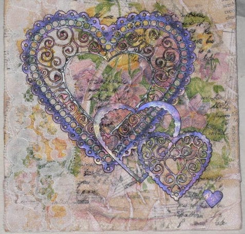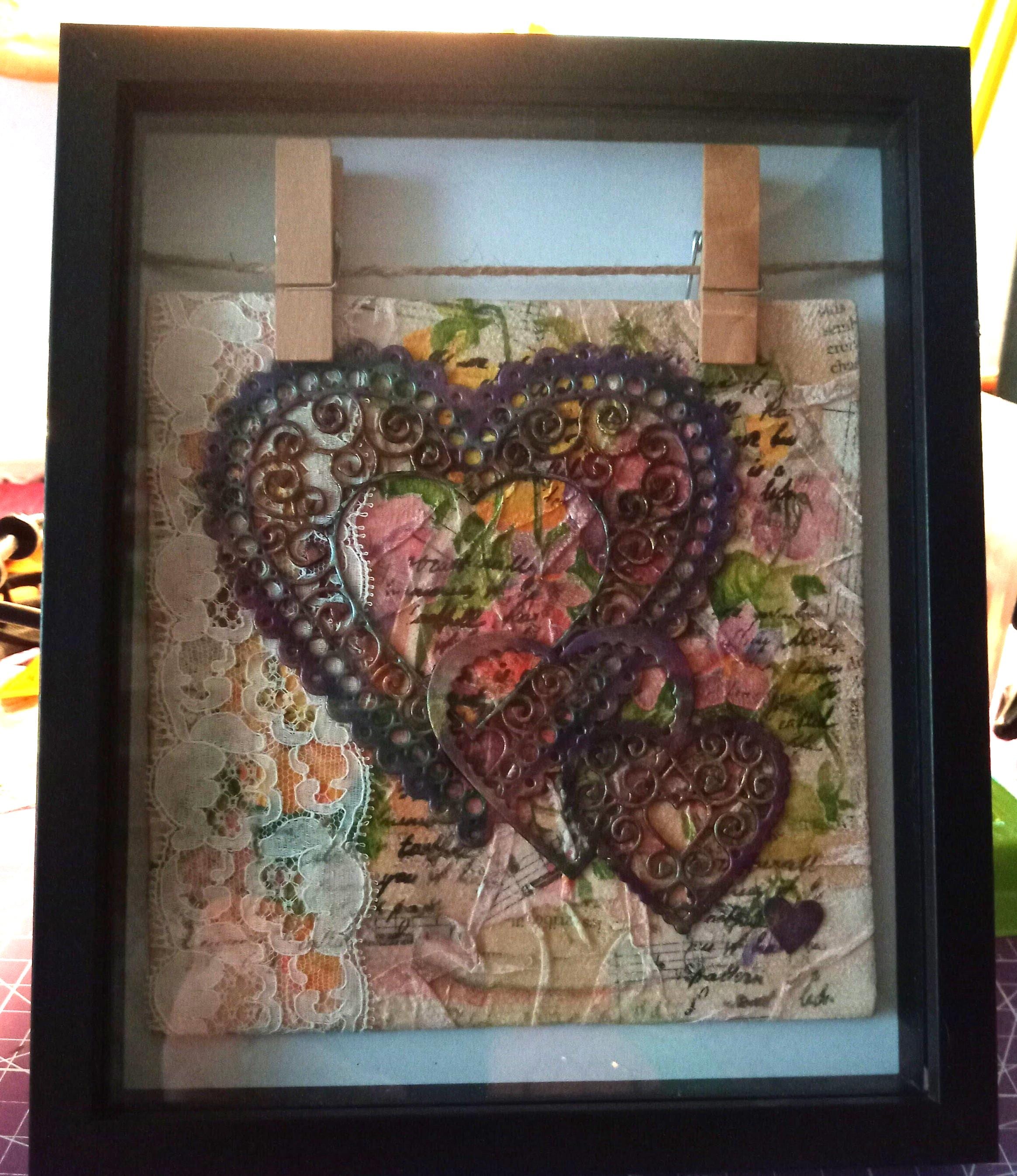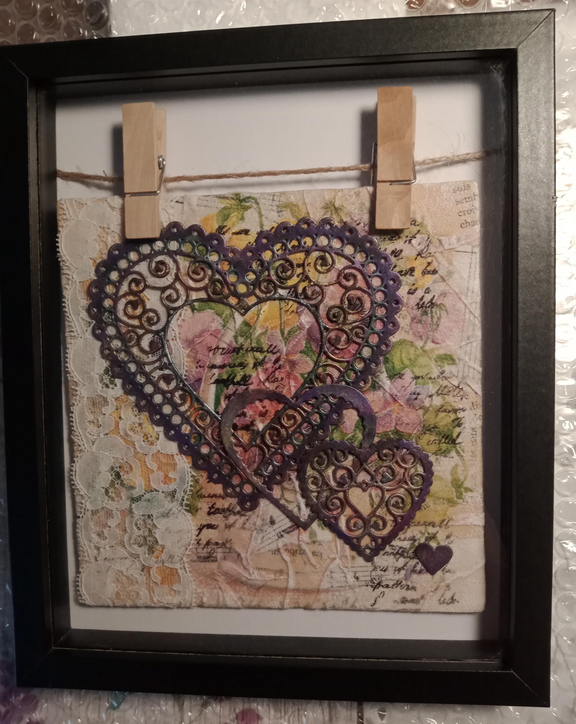 A lovely gift for Mother's Day, Grandmothers' Day, or why not Valentine's Day? And Christmas! Hanging wall decoration Collage on canvas against a background of fabrics and napkins. Paper and lace cutouts, colouring. Already framed Dimensions: 15cm x 15cm excluding frame To be suspended.