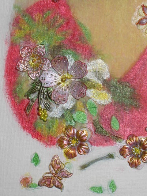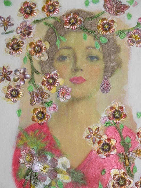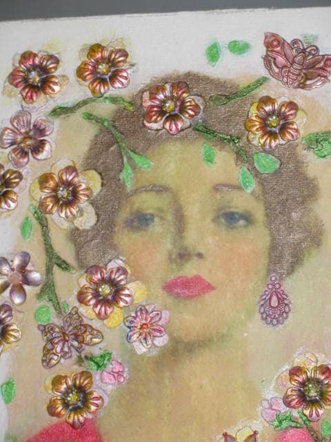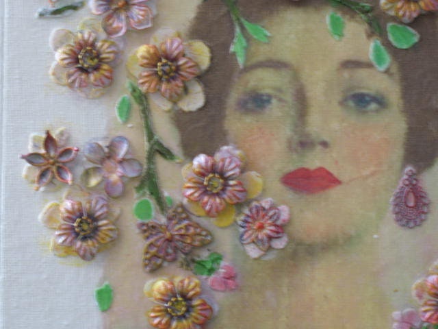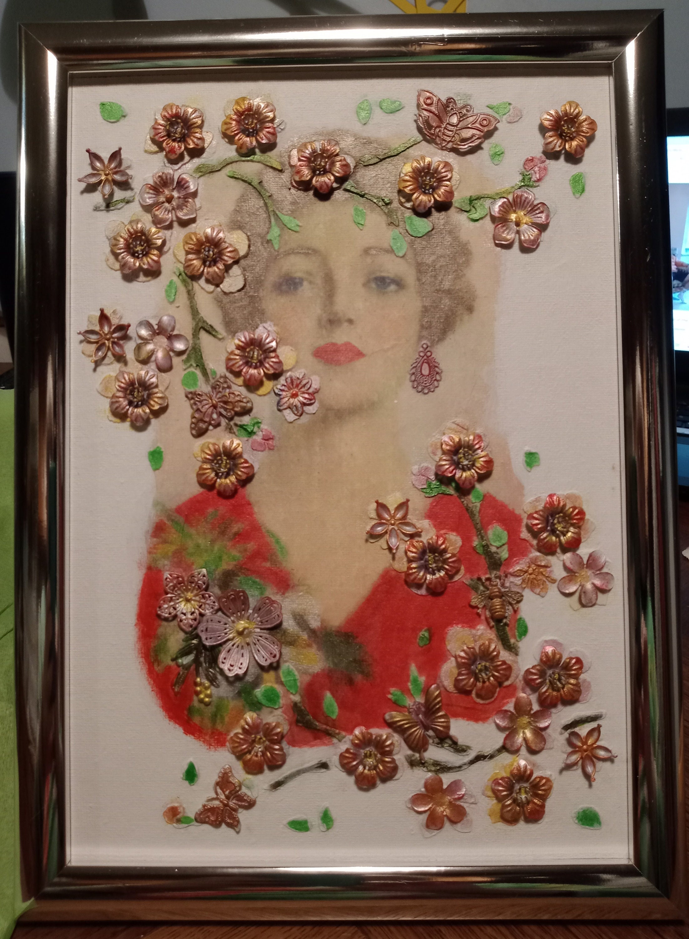 Mixed media collage on canvas, approximately A4 size including frame. Hanging wall decoration. Created with metallic decorations, texture paste, coloring. Portrait taken from Pinterest. I loved creating this painting and I really like the character. A painting with vintage tones, simply spring-like and soft.