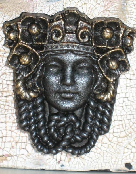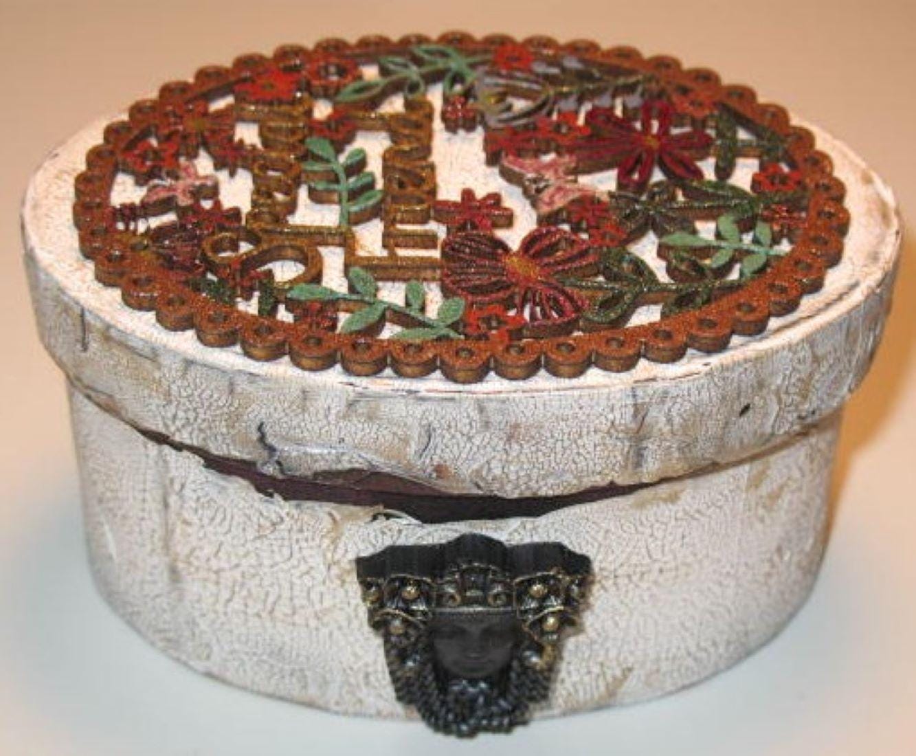 Small box measuring 12 x 8 x 6 cm, covered with crackle-textured paste and embellished with wood and resin. Coloured.