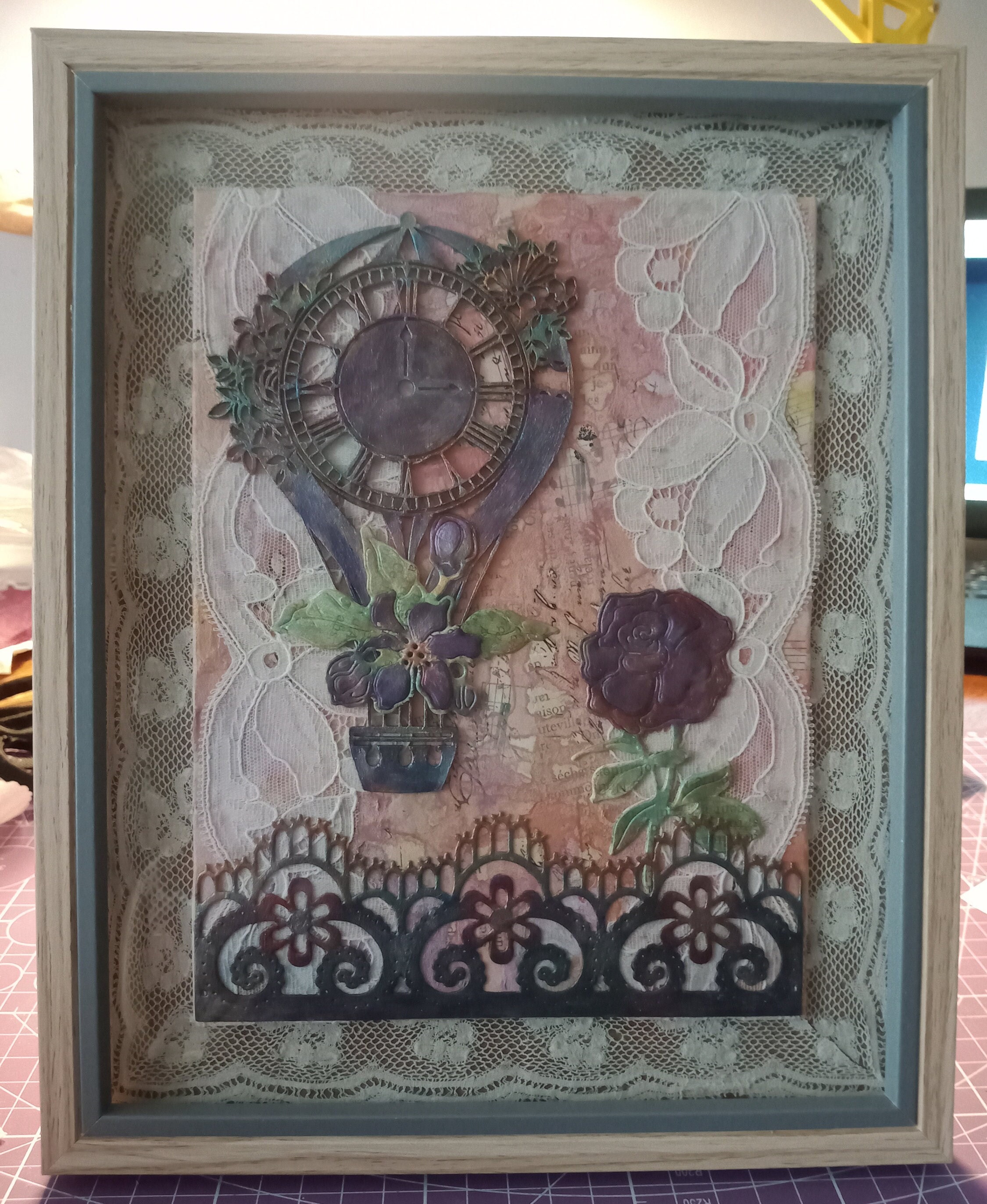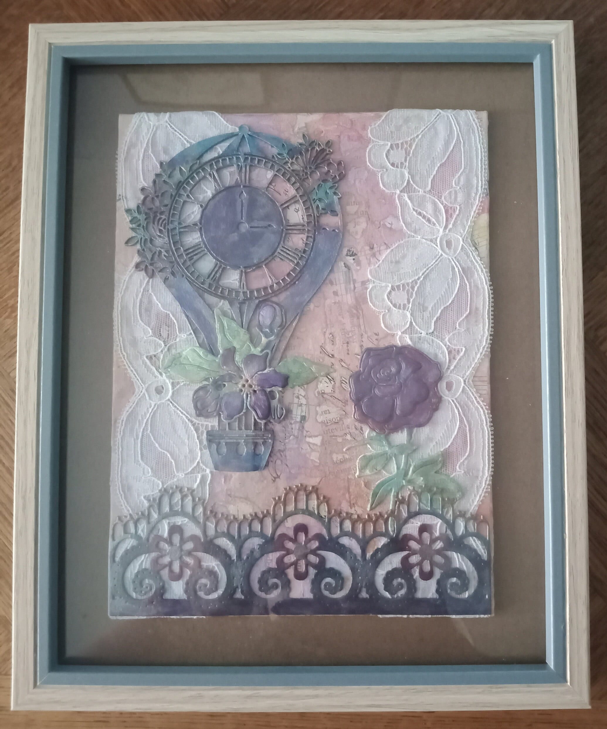 Collages on canvas against a background of papers, lace, cutouts and wood embellishments and colouring. Ideal as a gift for all occasions, or simply for yourself. Already framed Dimensions: 27cm x 22cm hanging wall decoration