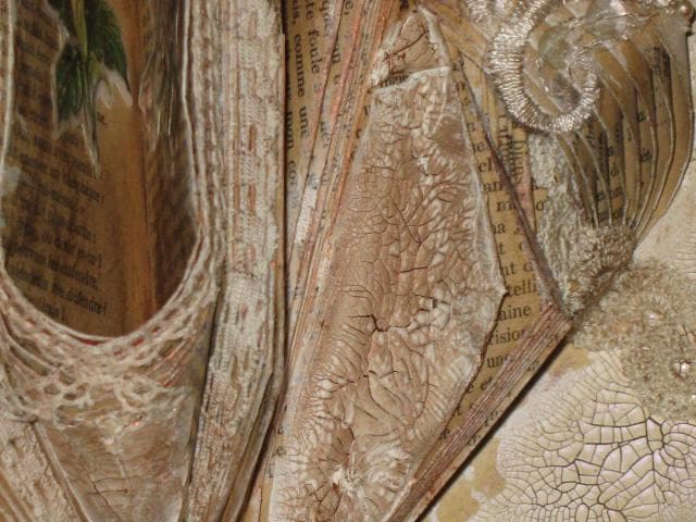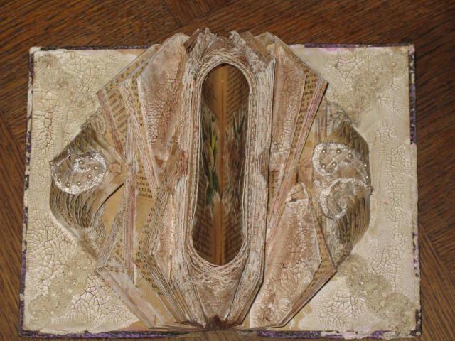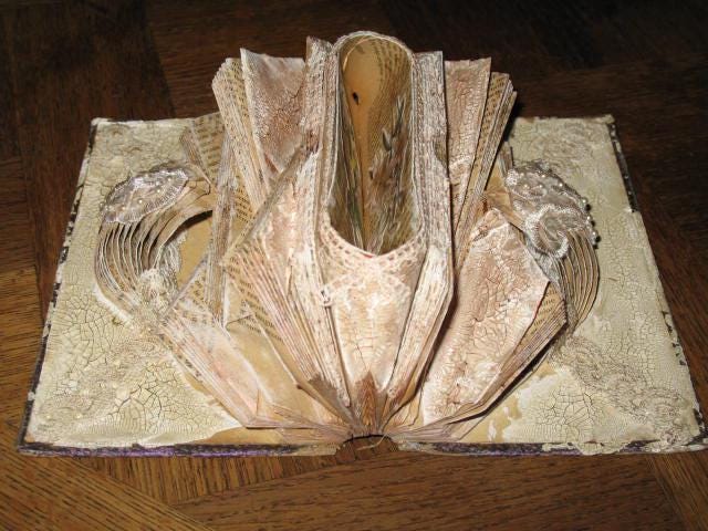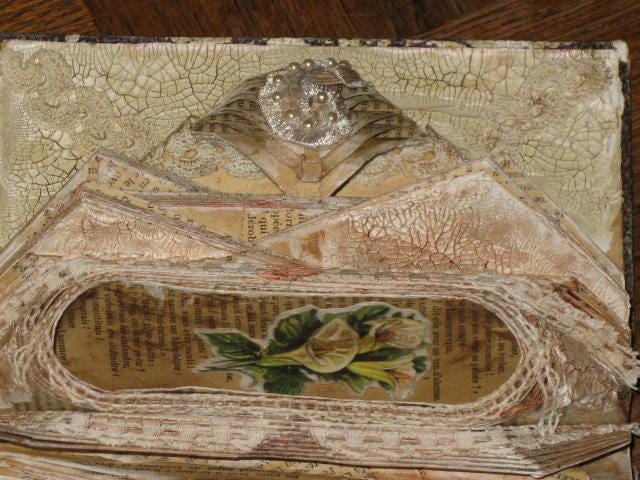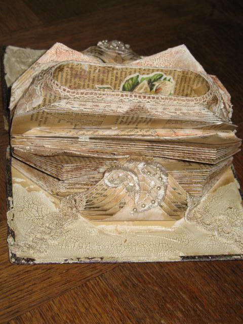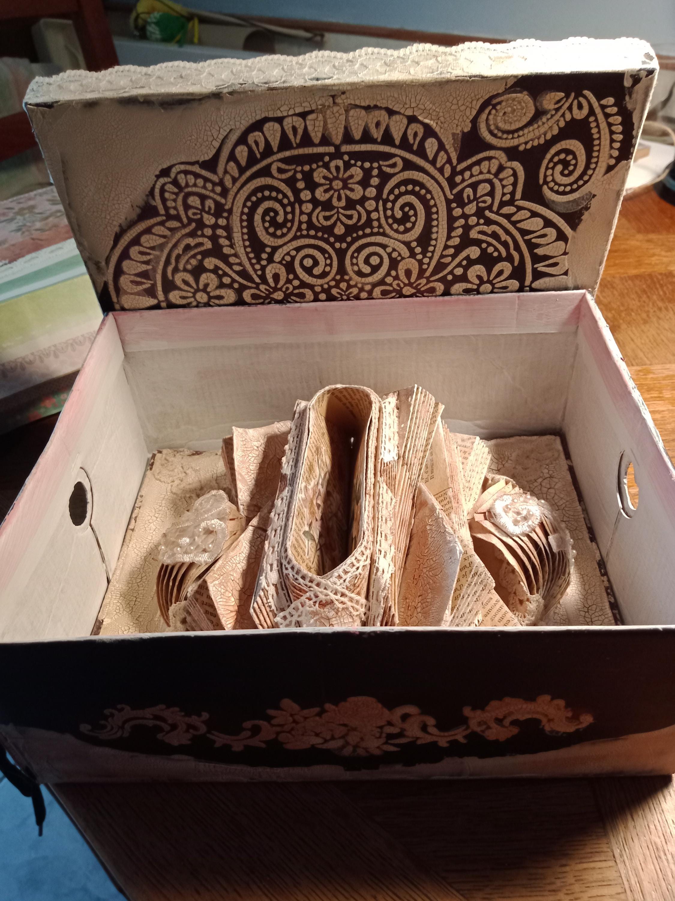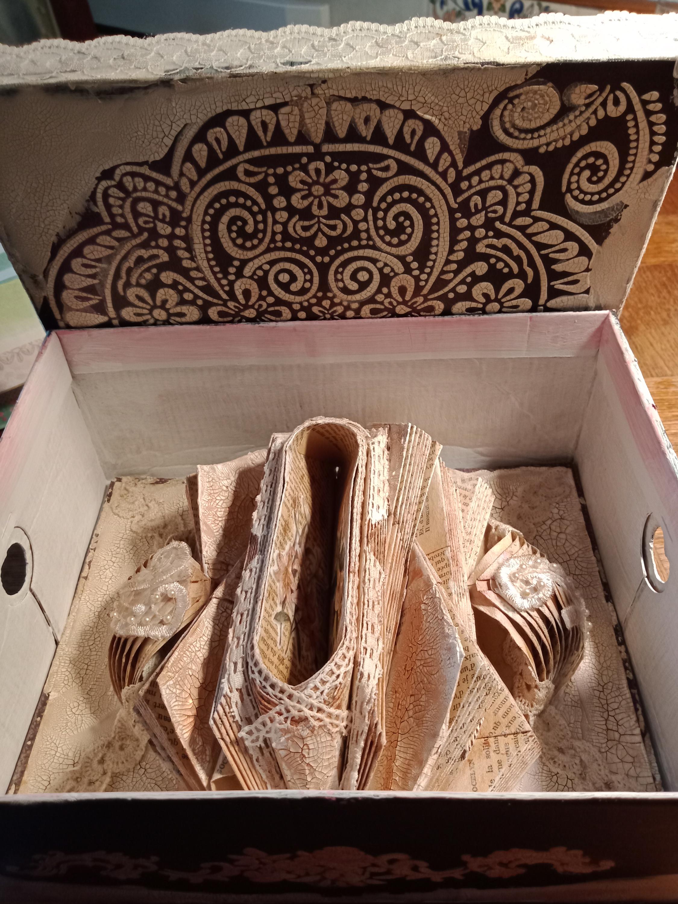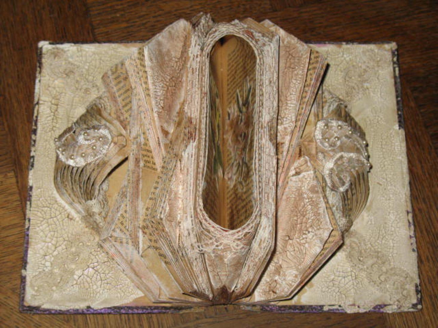 A folded book shaped like a vase. It can be used as a vase for dried flowers, as a container for business cards, or even as a catchall. Or whatever you like... Sold with a matching box in the book's colors. The box can be used to store the book or other items. Waxed crackle paste decorations. Vintage style. An original gift to give, or to treat yourself to for its practicality.