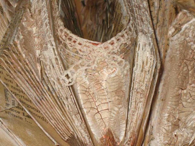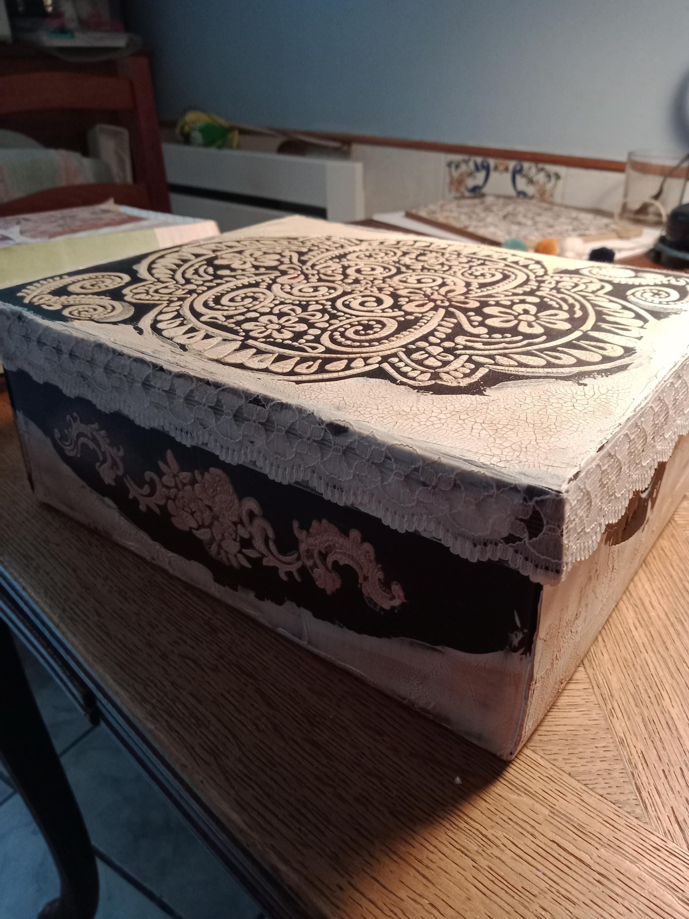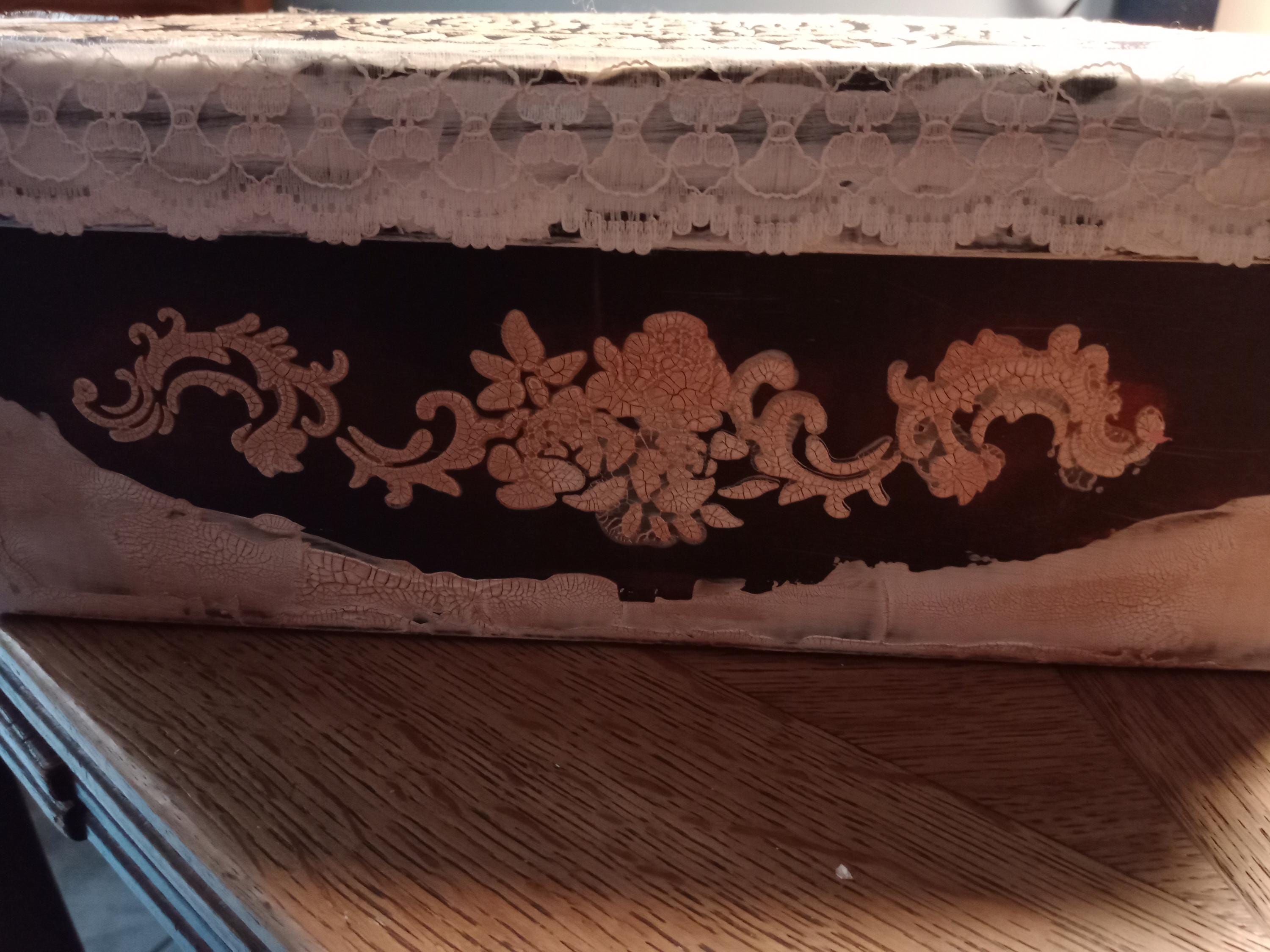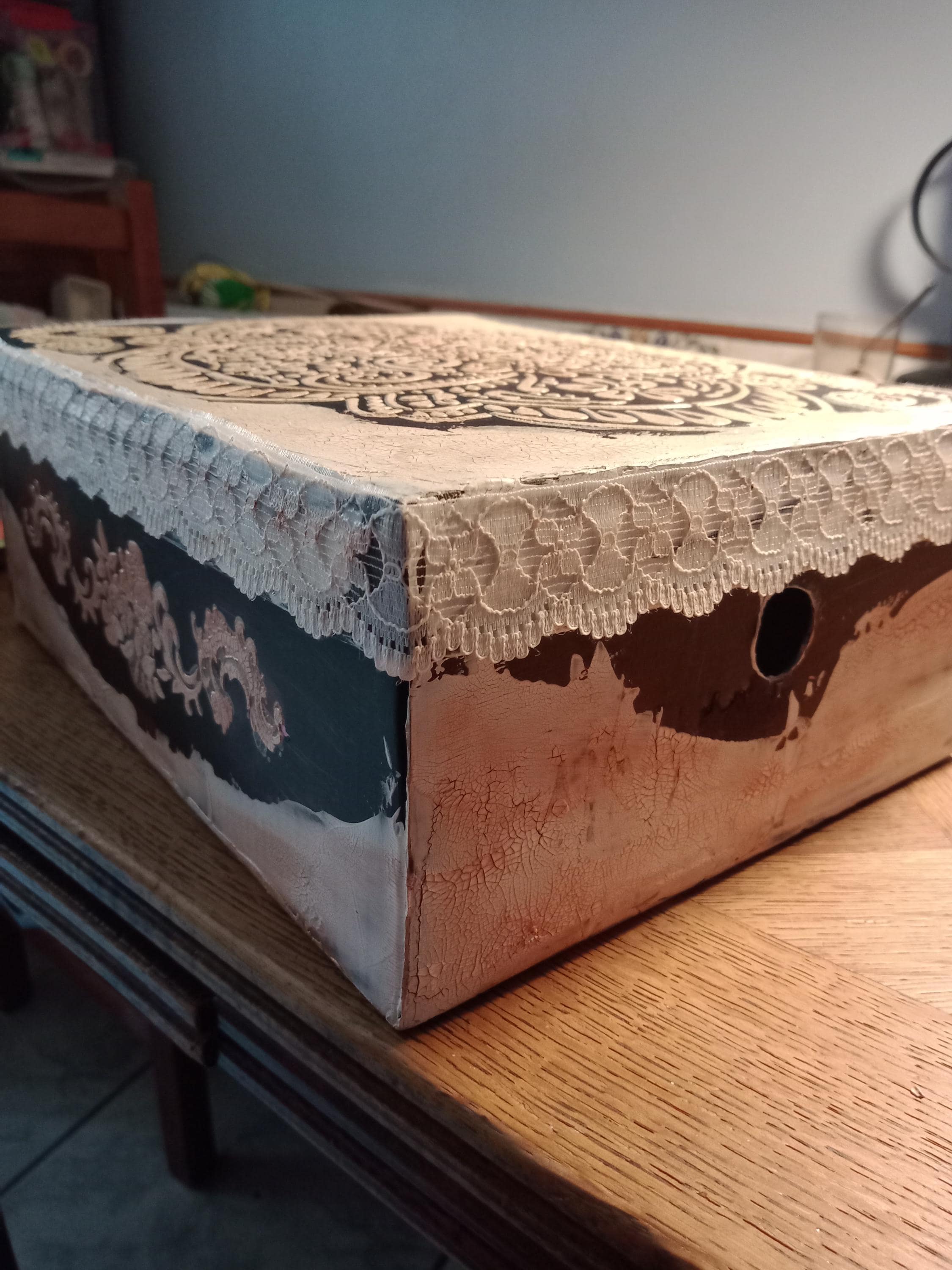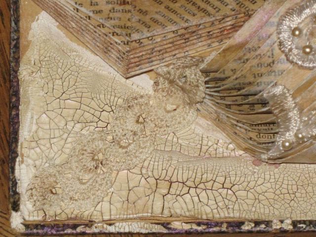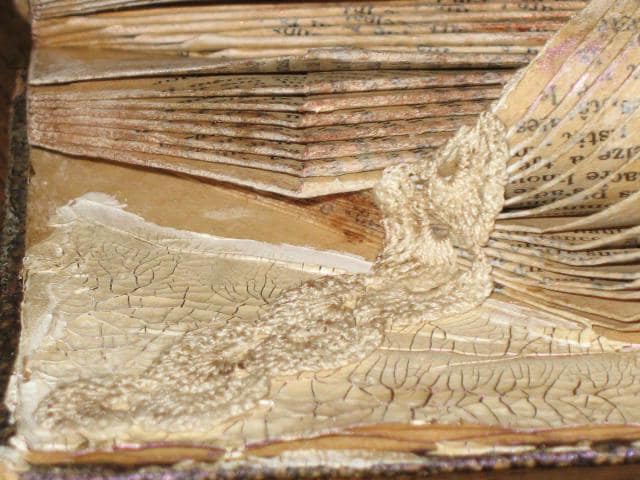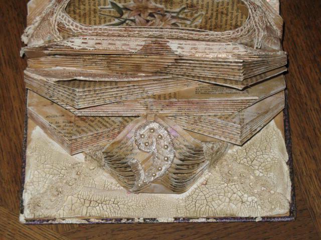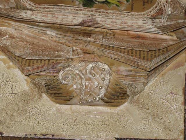 A folded book shaped like a vase. It can be used as a vase for dried flowers, as a container for business cards, or even as a catchall. Or whatever you like... Sold with a matching box in the book's colors. The box can be used to store the book or other items. Waxed crackle paste decorations. Vintage style. An original gift to give, or to treat yourself to for its practicality.