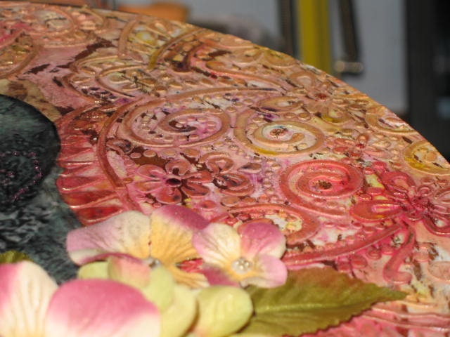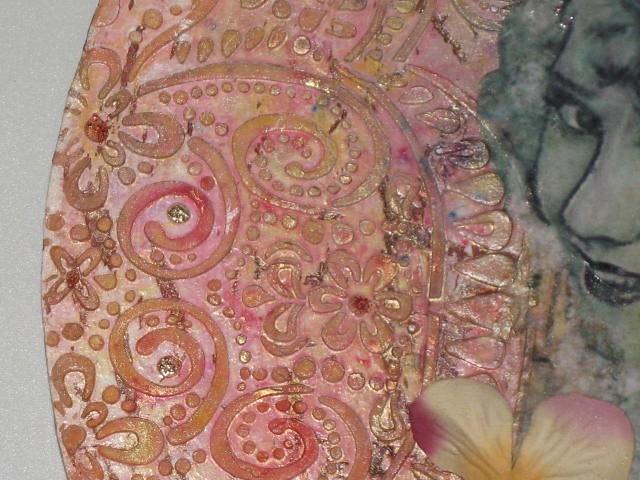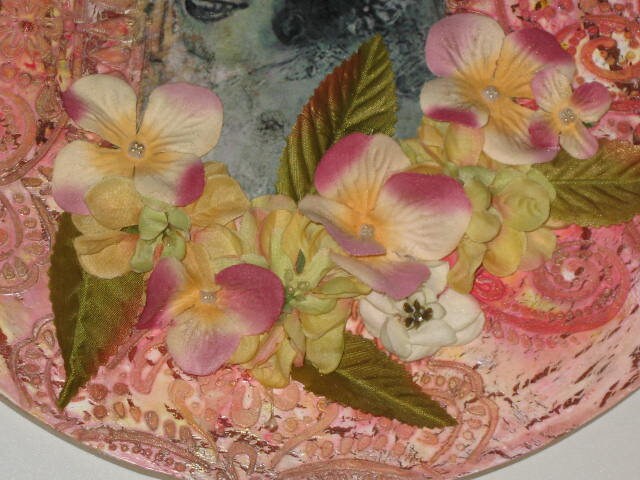 Un tableau de bois rond de 30cm de diamètre environ à suspendre Style vintage avec un visage féminin et des fleurs artificielles. Collage sur un fond fait de pâte à structure colorisée, et cirée relevé de strass. Couleurs pastel. Diamètre 30cm