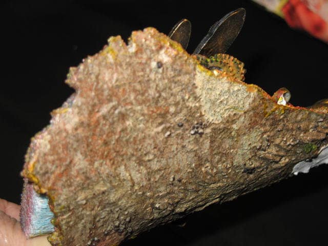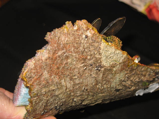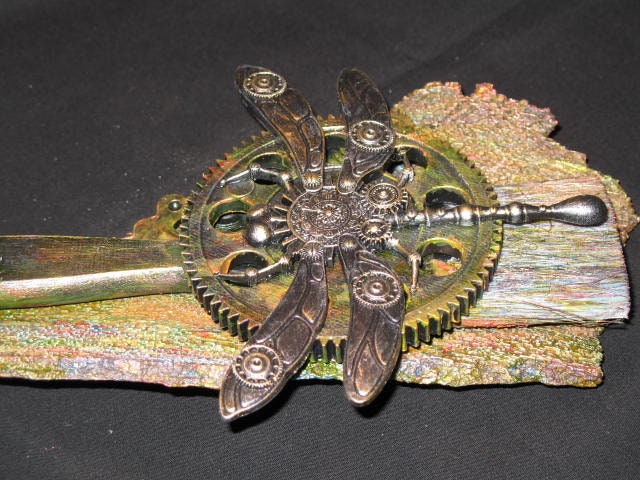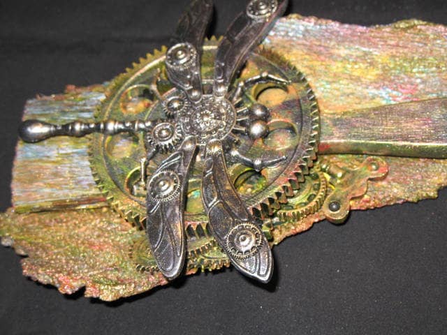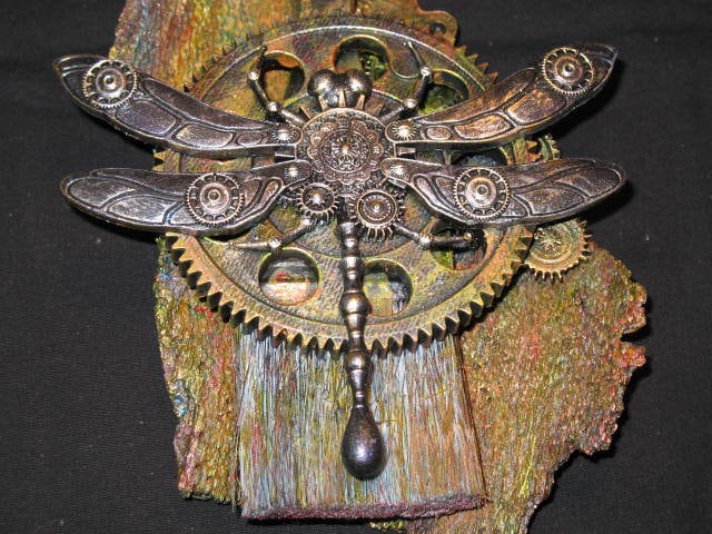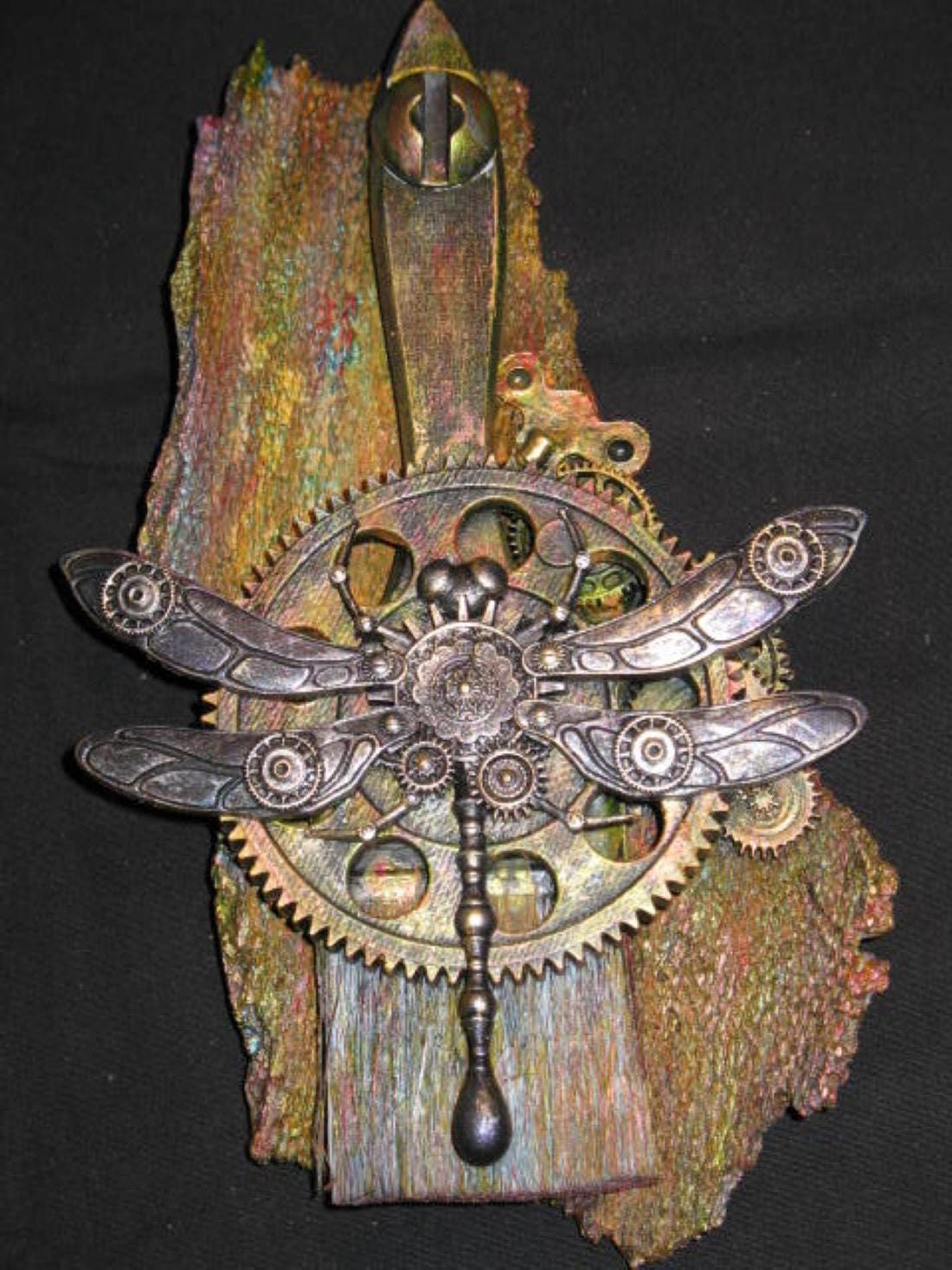 Cette libellule à rouages s'est posée sur un pinceau qui était accroché à un morceau d'écorce. C'est biensûr une image! C'est un collage sur un morceau d'écorce hêtre. Un pinceau, des rouages et une libellule représentée avec des rouages pour décoration. Cette création mesure environ 25 cm de haut pour 15cm environ de large. On la suspend grâce à une pastille adhésive collée au dos. Une décoration originale à s'offrir ou à offrir à n'importe quelle occasion. Sortons de l'ordinaire!