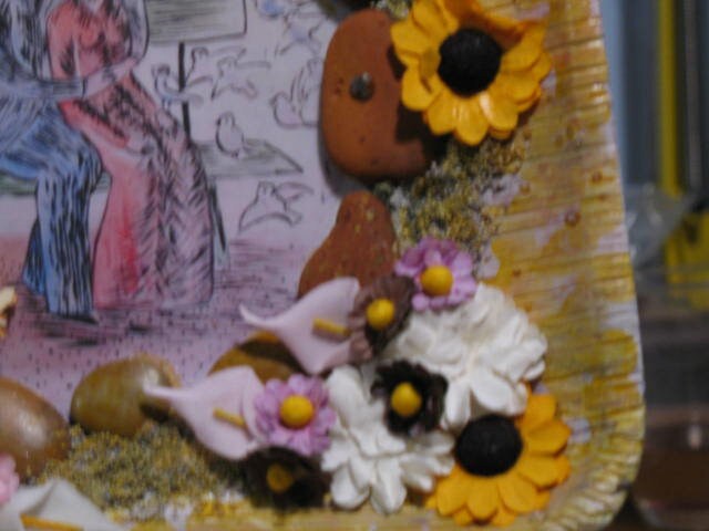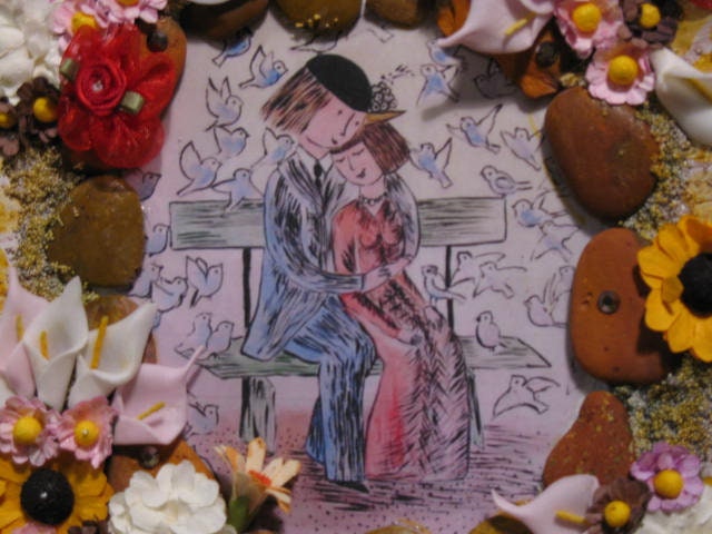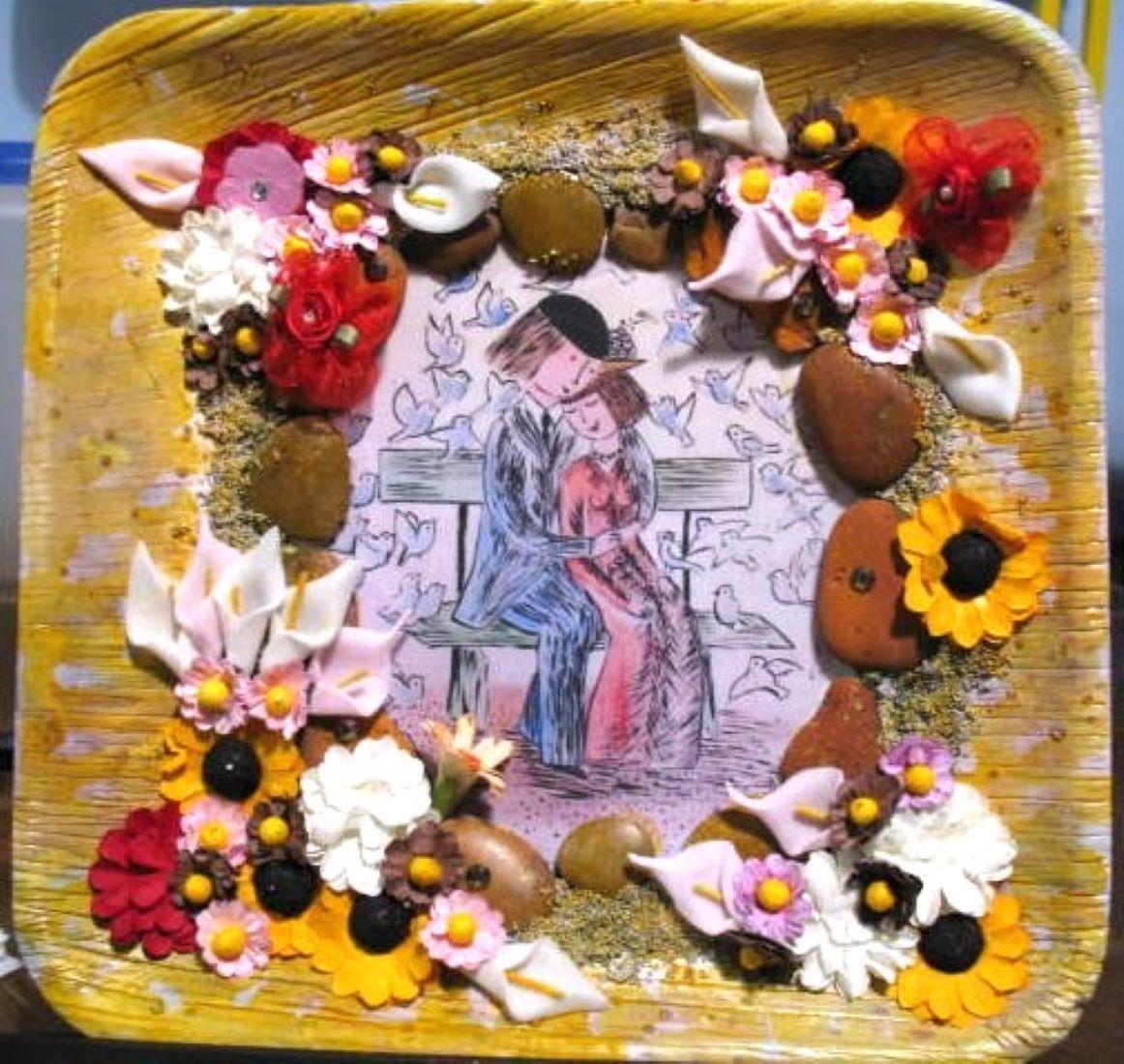 Adapted from an image taken from Pinterest. Collage on a bamboo plate. Pieces of bricks rolled by the Mediterranean Sea, artificial flowers, a colouring. Dimensions 20 x 20 cm Original decoration for Valentine's Day. Can be hung or placed on a suitable support. You can give it as a gift or treat yourself.