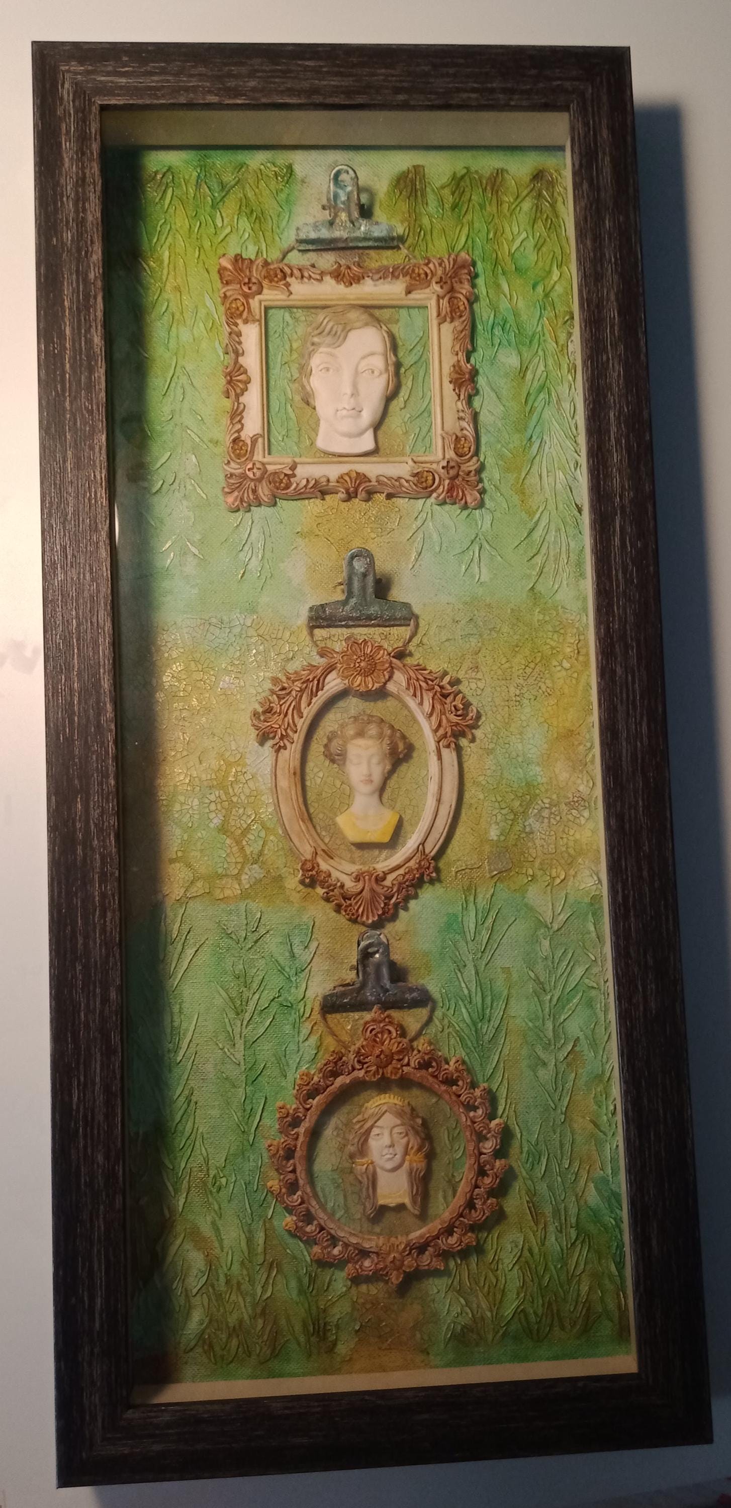 J'ai appelé ce tableau style vintage "Génération" Les femmes d'hier à nos jours. Des portraits de mère en fille en quelques sortes. Grande dimensions 24 x 55cm environ Collages sur toile, pate à structure, moulages, colorisation Cadeau très original à suspendre. A offrir dans n'importe quelles occasions, ou à s'offrir si on veut avoir quelque chose d'original chez soi.