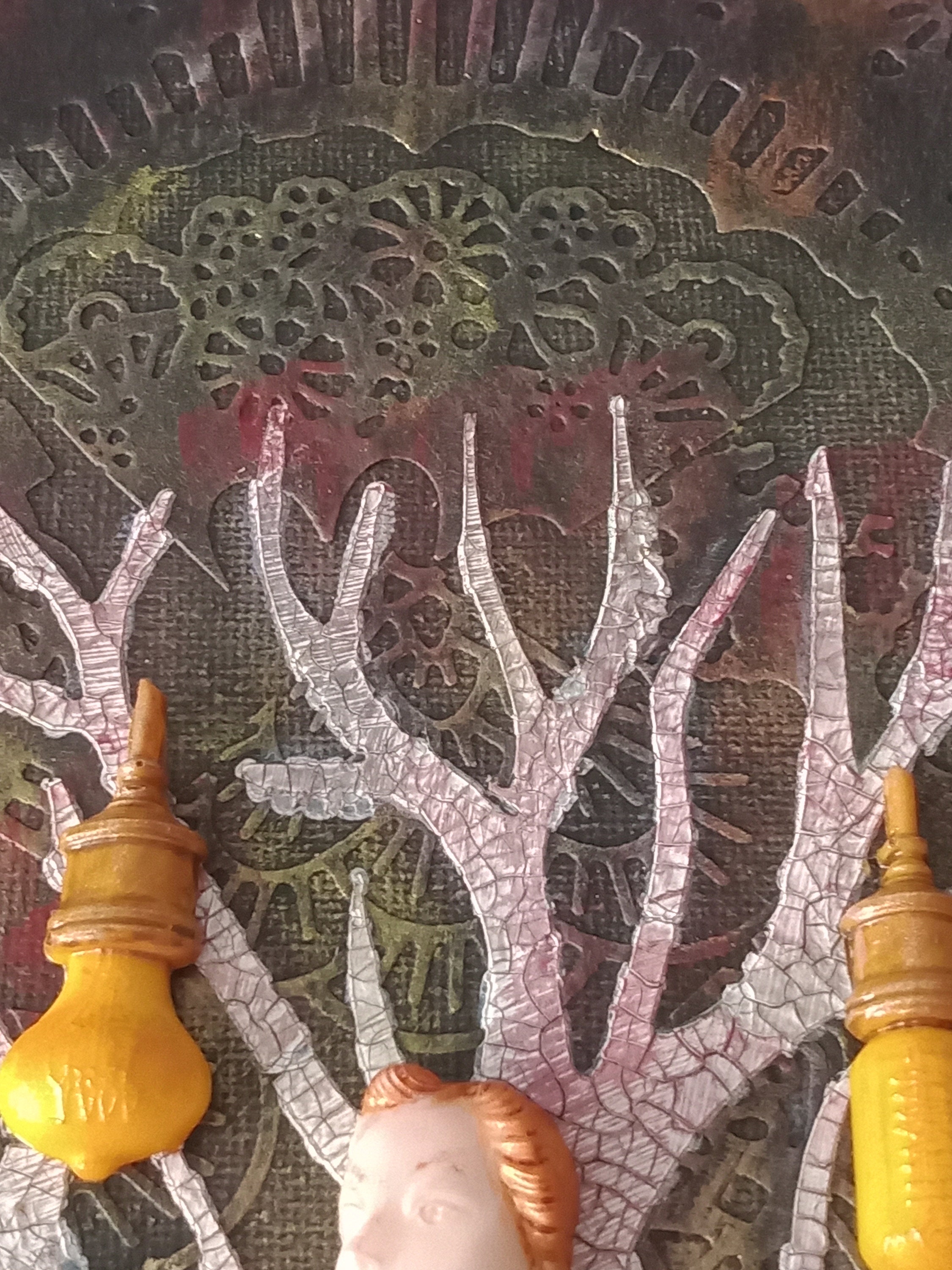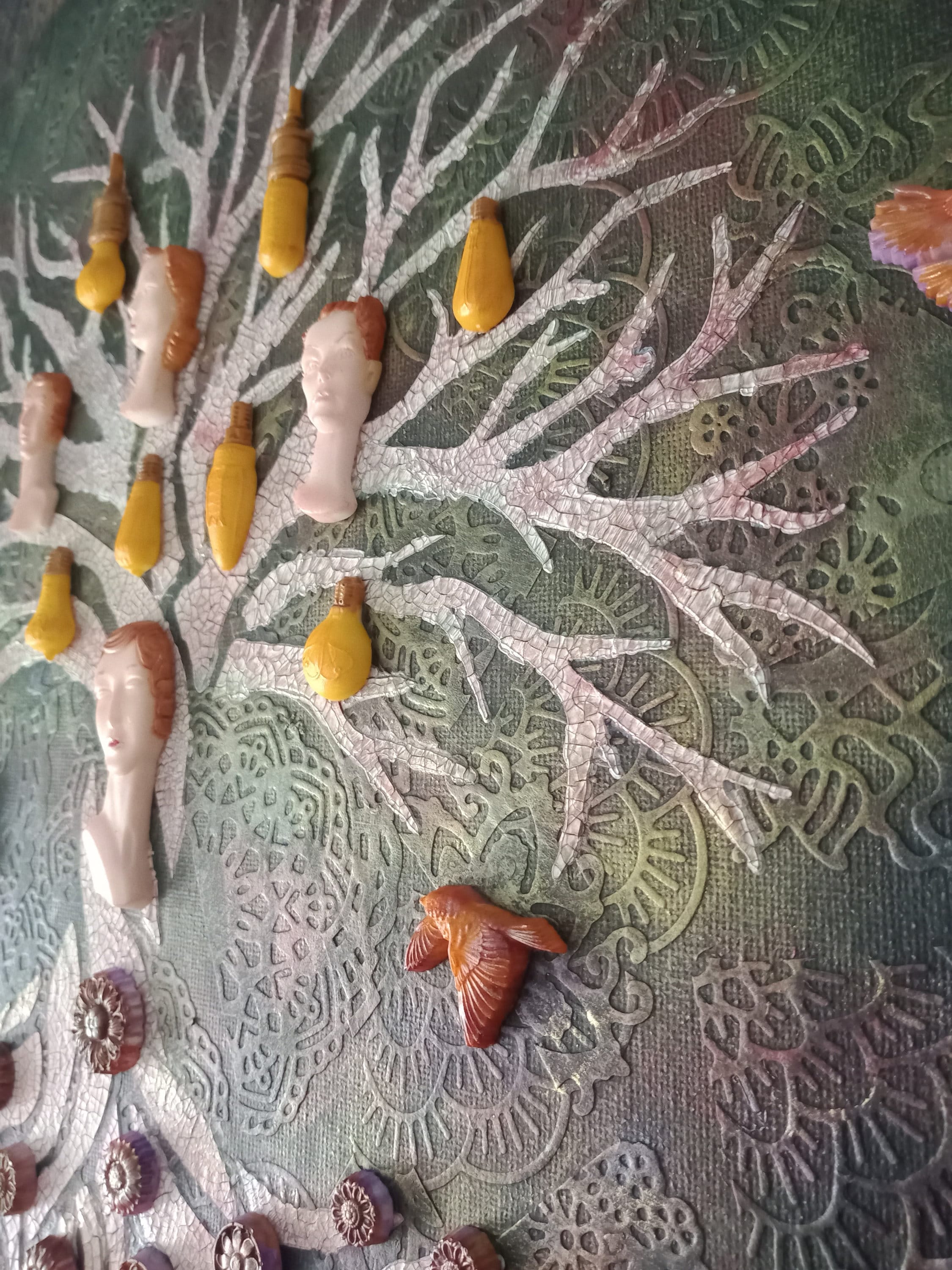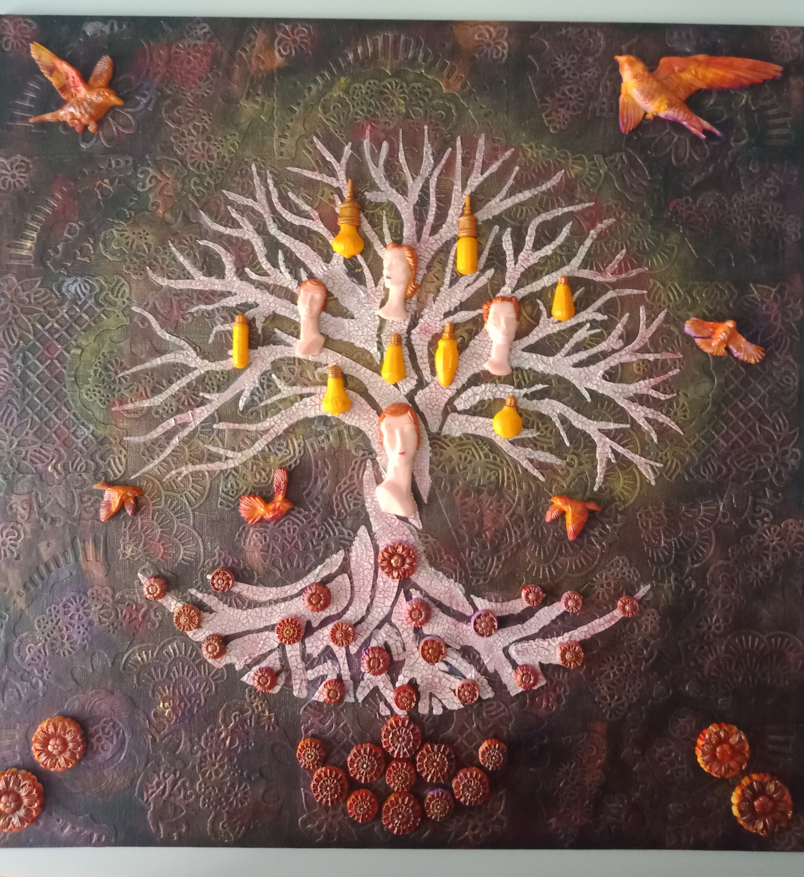 Tableau "Arbre de Vie au féminin" Mix media. Toile de 40 x 40 Nous puisons dans le sol des fleurs, et nous devenons des femmes pour être l'avenir de l'Homme. pate à structure, moulages, colorisation.