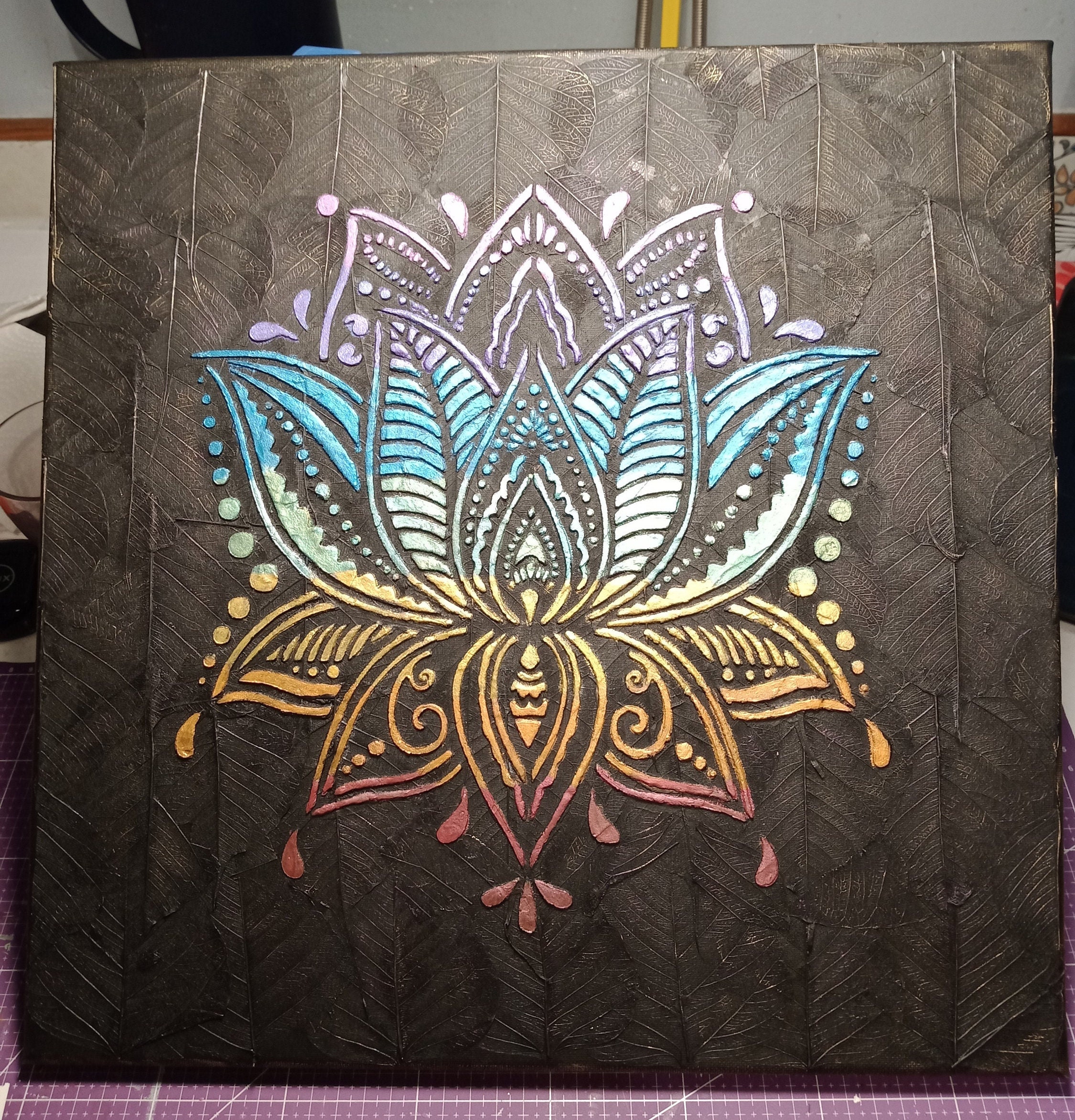 Tableau sur la couleur des Chakras. 40 x 40 cm Fond fait de feuilles squelettes collées, motif en pate à structure et colorisé de la couleur des Chakras. Cadeau original à offrir en toutes occasions ou à s'offrir tout simplement.