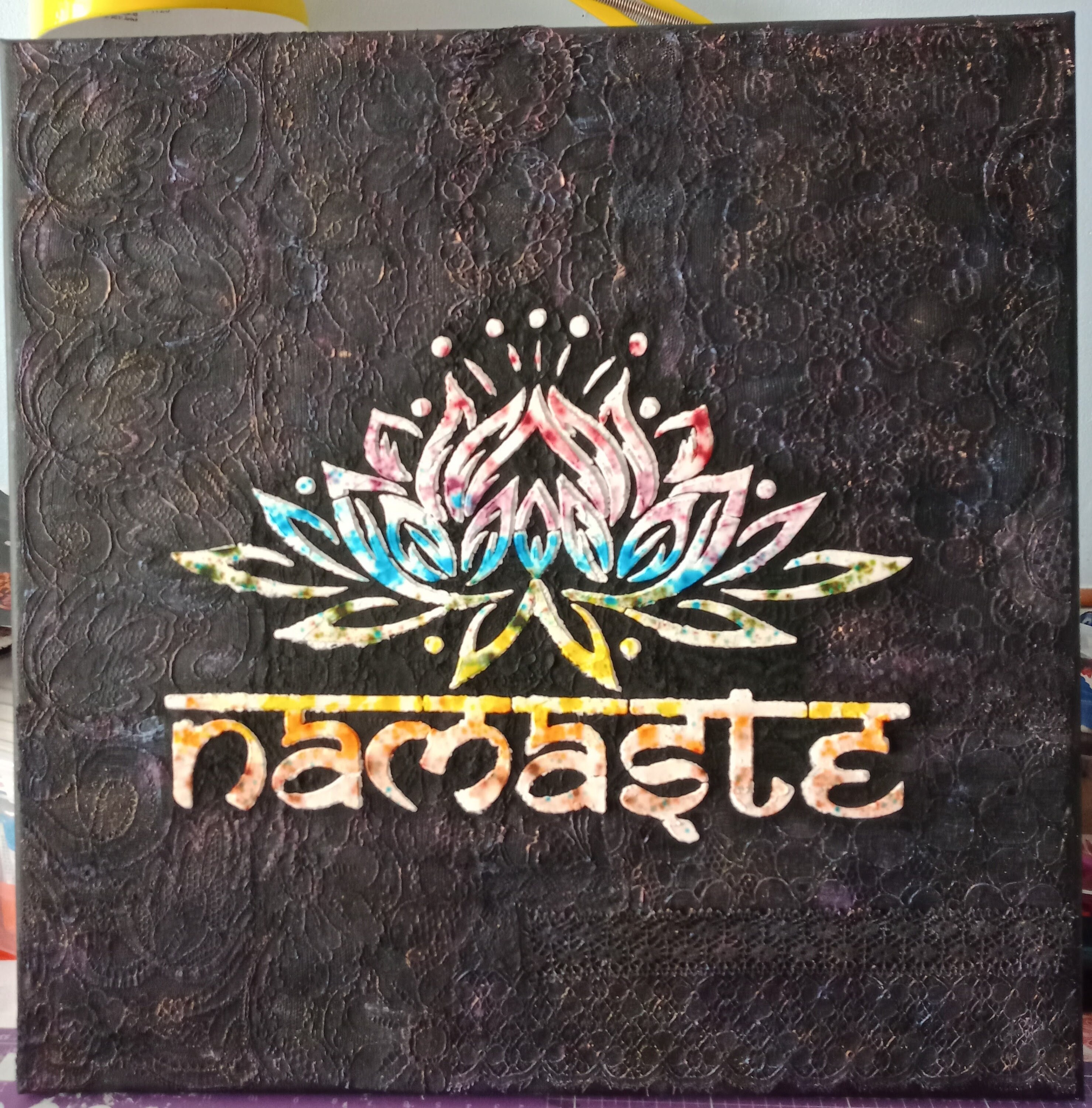 Tableau "Namaste" sur un fond de dentelles. Dentelles, pate à structure, colorisation, 40 x 40cm A offrir pour une ambiance zen en toutes circonstances, ou à s'offrir tout simplement parcequ'on aime.