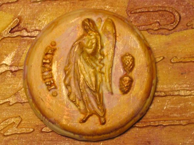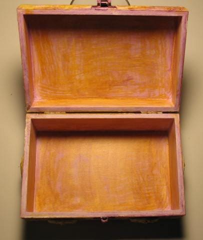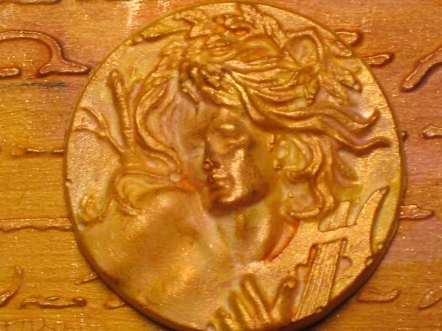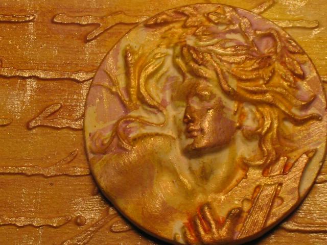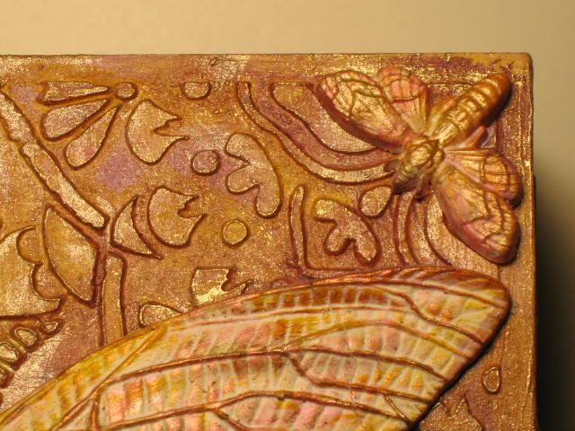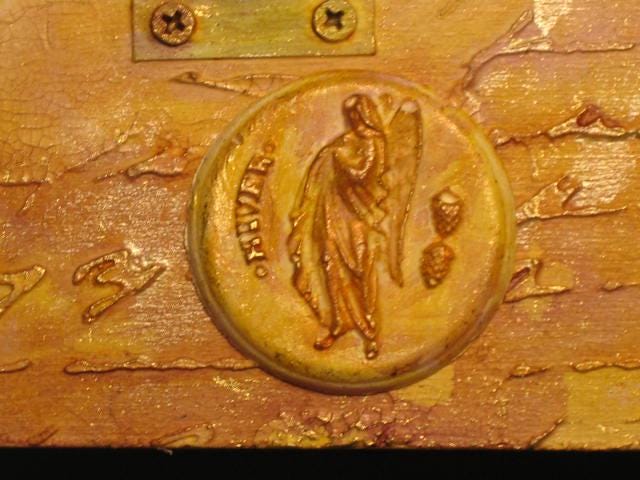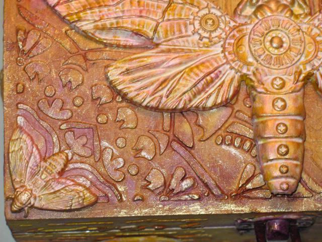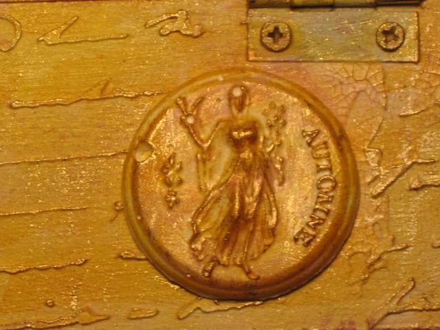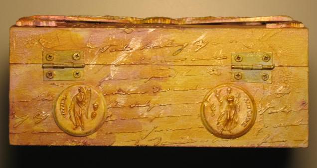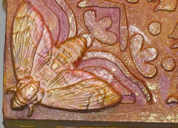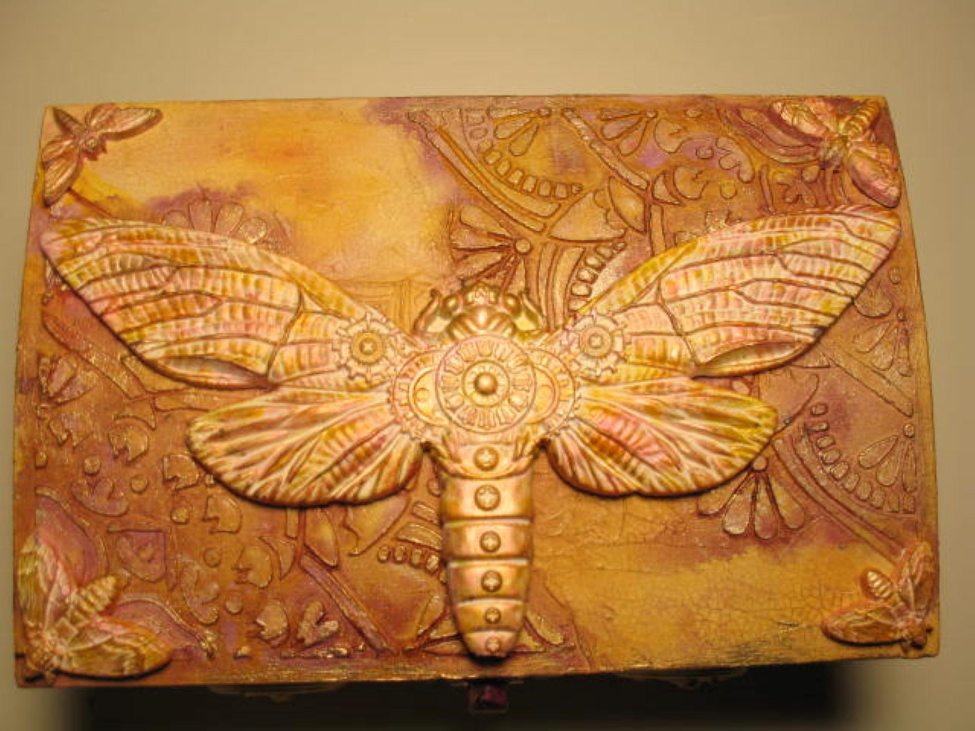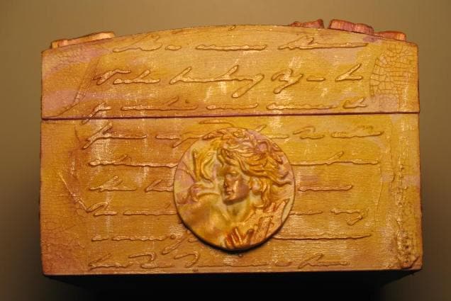 A pretty storage box decorated with molded butterflies and portraits, all colored in beautiful warm hues.