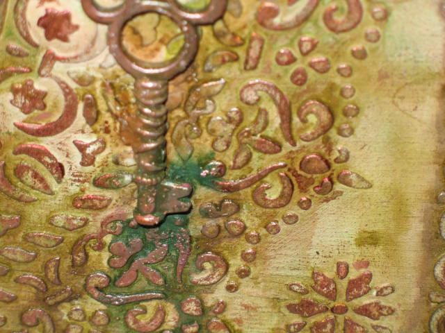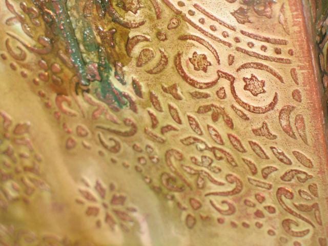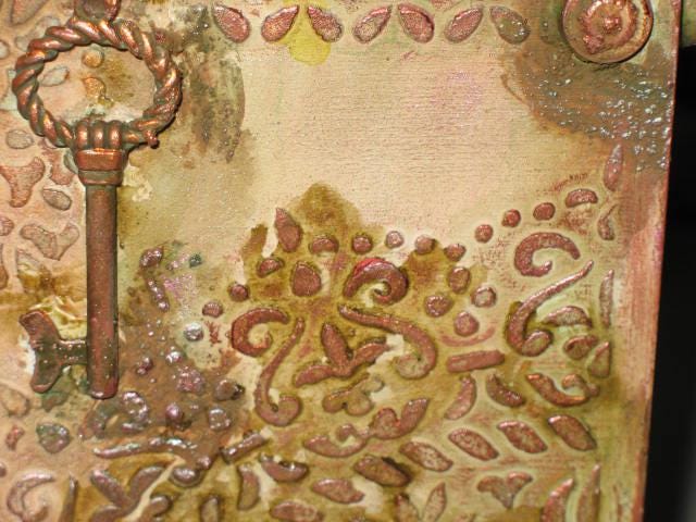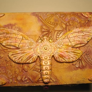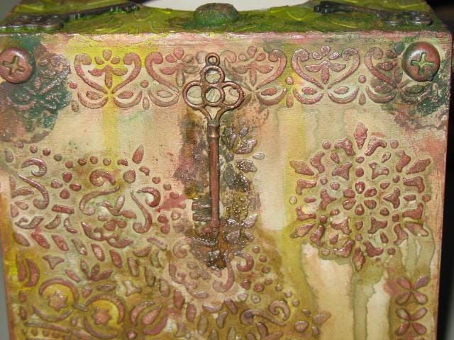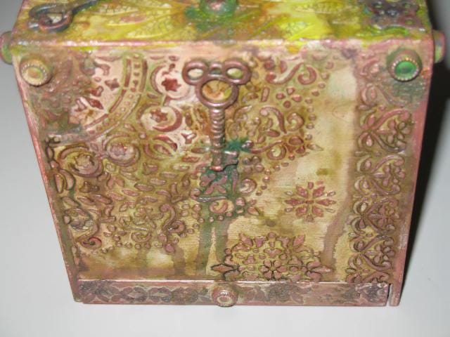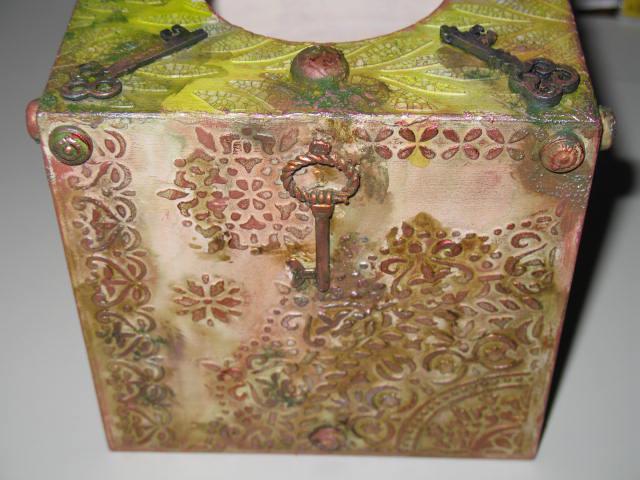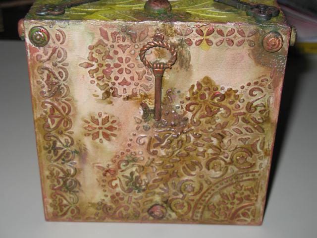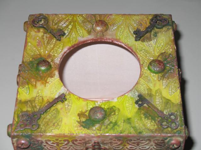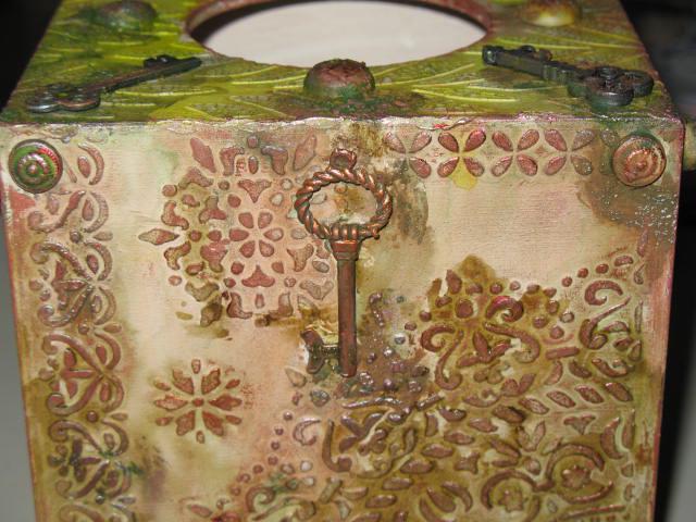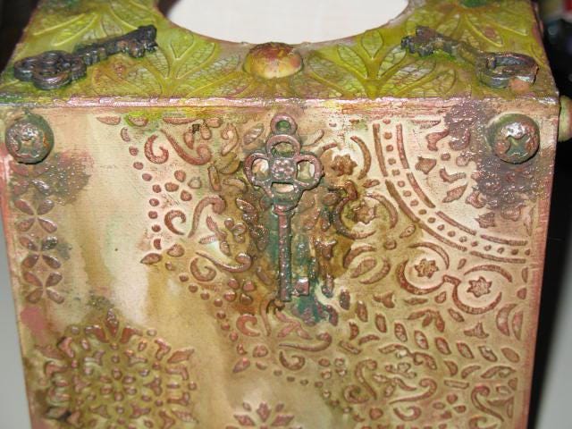 It is made of wood and opens from the bottom to be filled. Decorated with ornaments also made of wood and cardboard, I colored it with acrylic paint, with a wax finish.