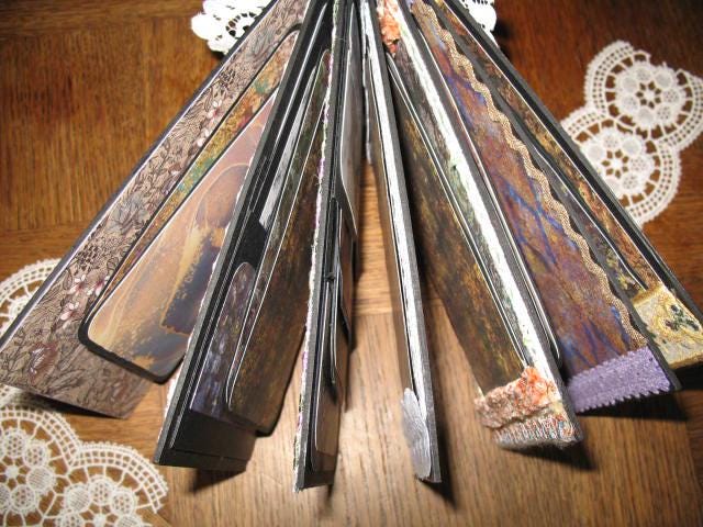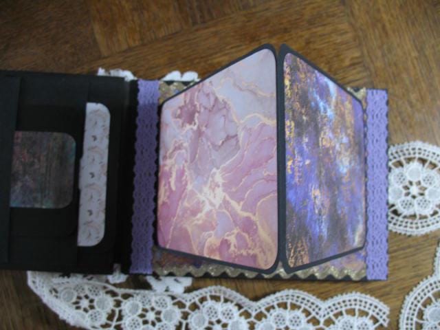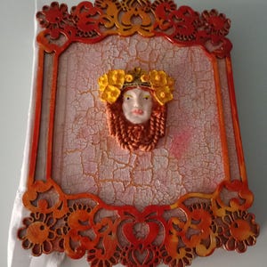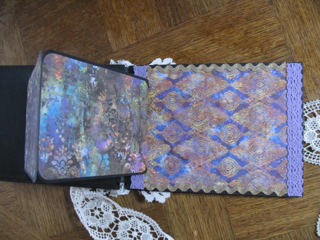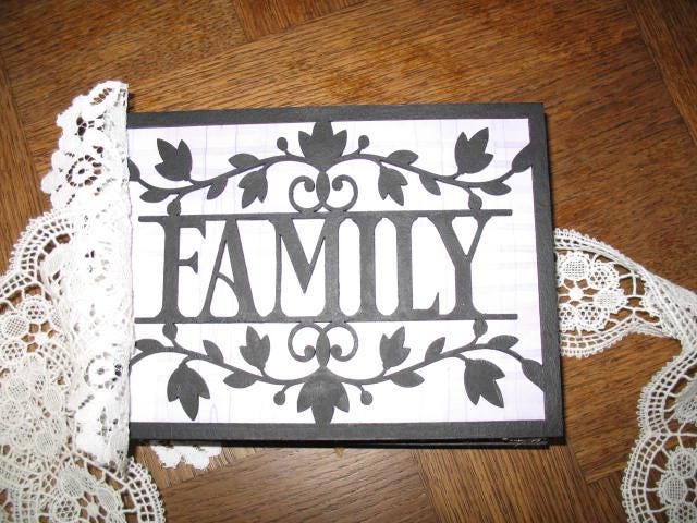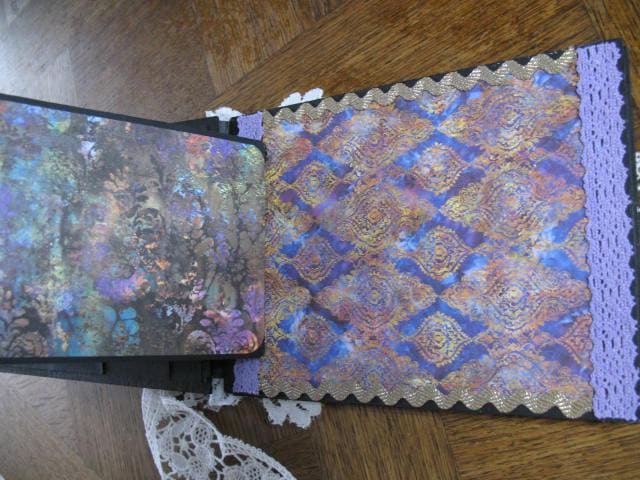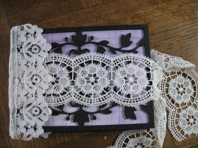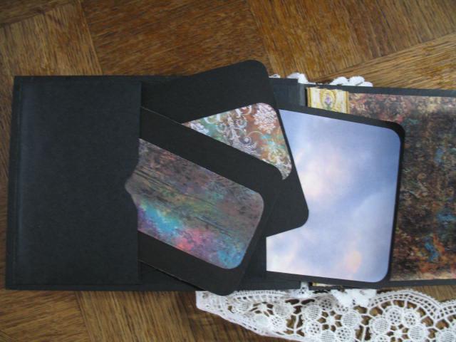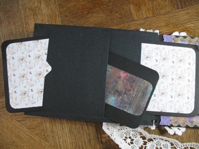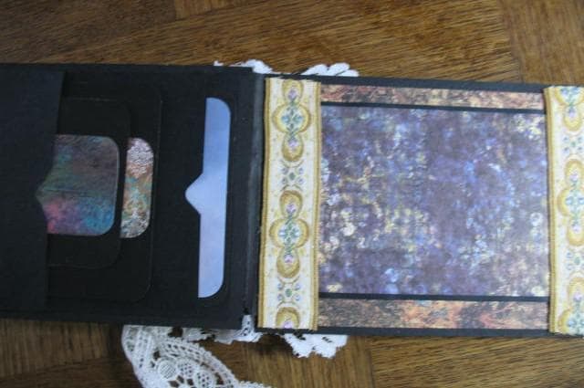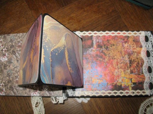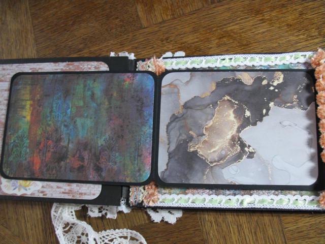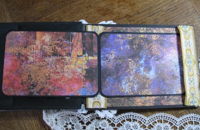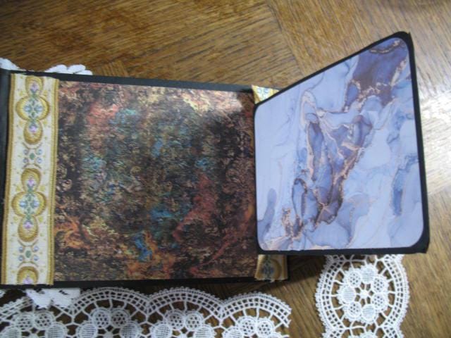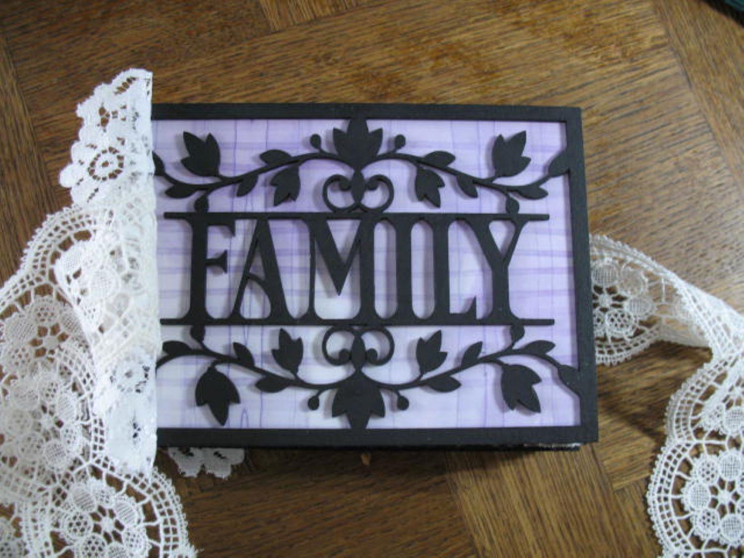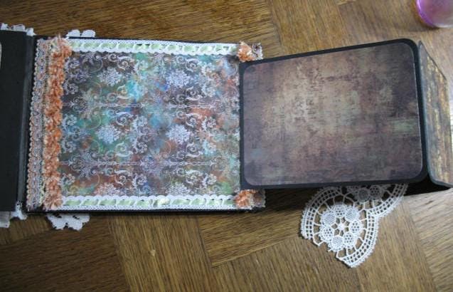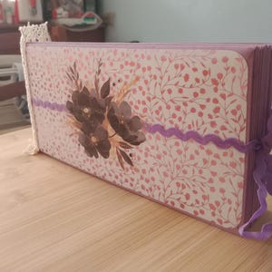 Wooden scrapbook photo album. The 6 pages plus the cover are made of wood covered with decorated paper and lace. Closed by a knotted lace that goes around the album. Dimensions: 19 x 14 x 5 cm